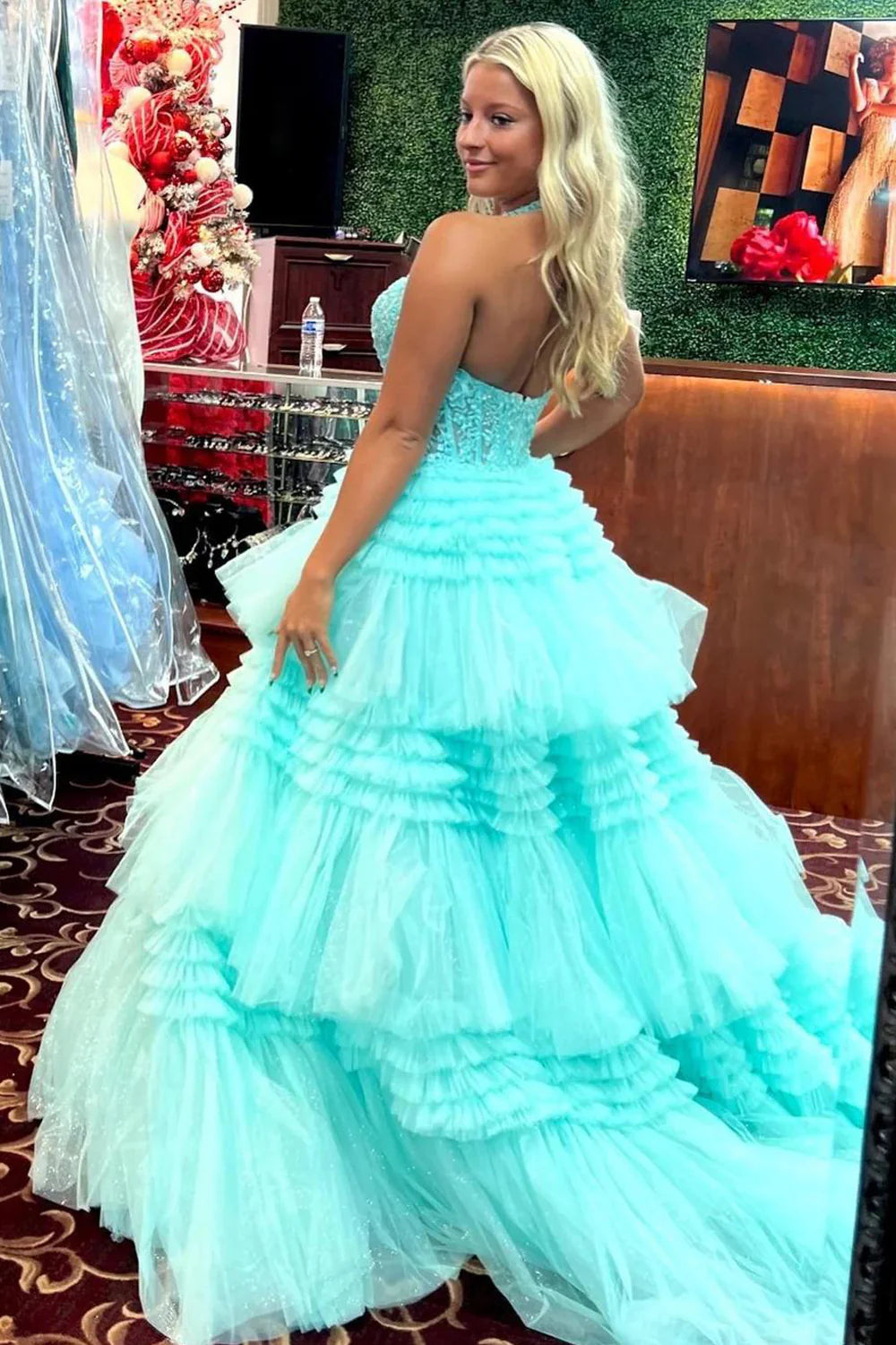 This elegant halter gown features a halter neckline and exquisite lace appliques. The cascading ruffle tiered skirt adds a touch of drama, while the zipper back ensures a secure fit. Perfect for prom or any formal occasion.