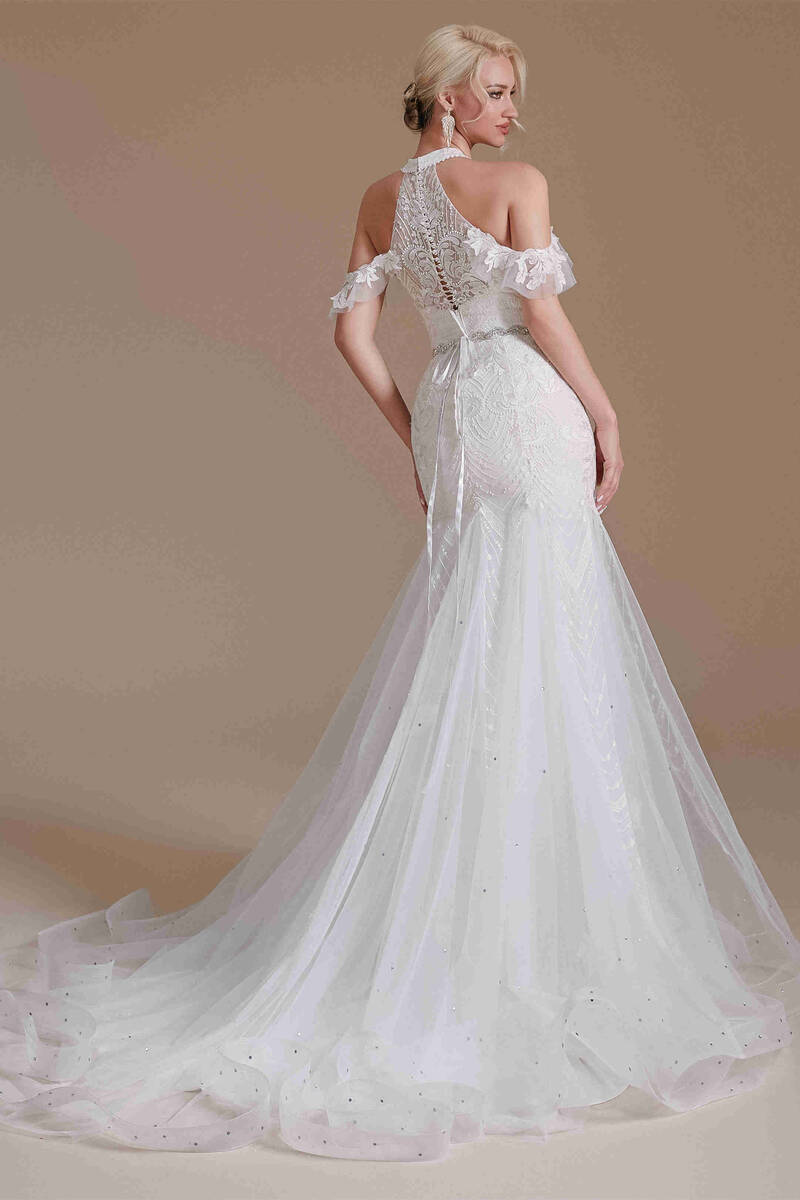 Halter White Lace Mermaid Wedding Dress with Detachable Sleeves