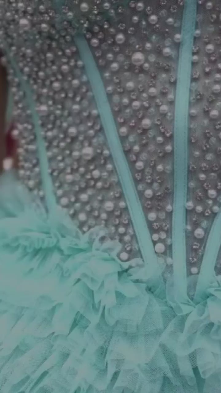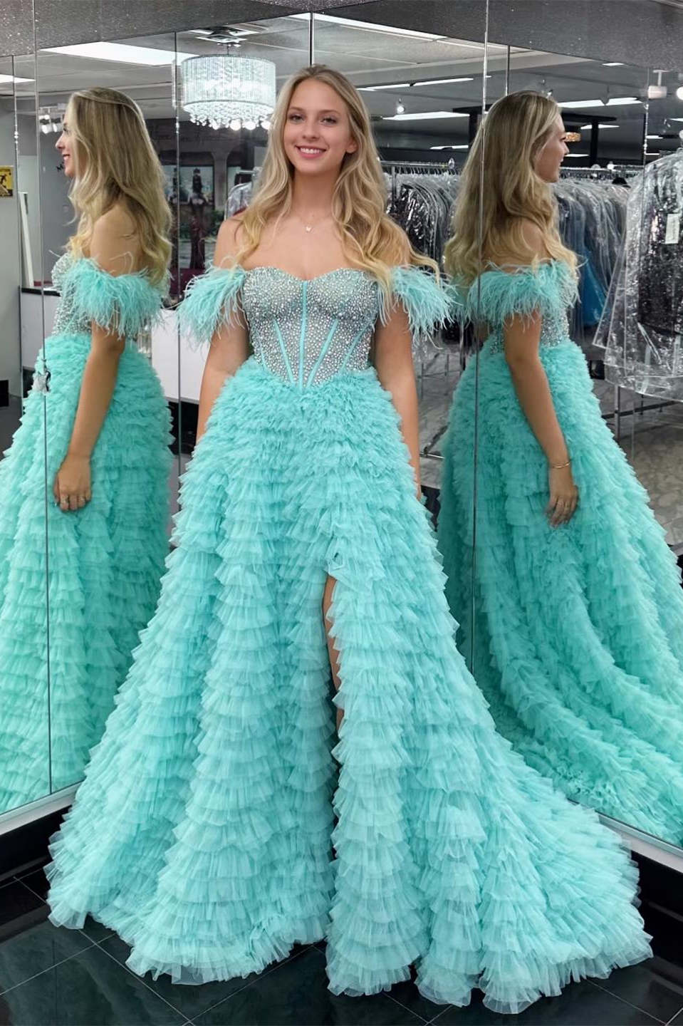 Fancyvestido this prom dress features a sweetheart neckline with a cold shoulder design edging intricate feathers, a sheer beaded corset bodice with a plunging V back. The look is fabulously complete with the ruffle layers on the skirt.