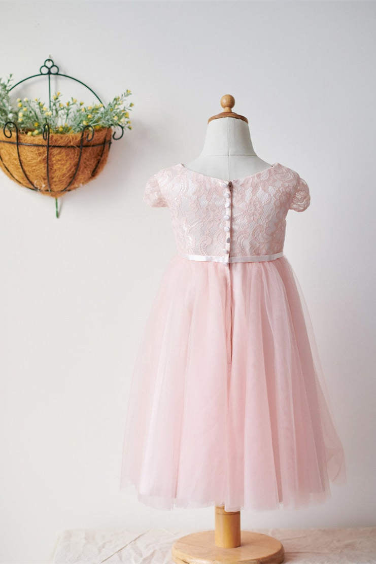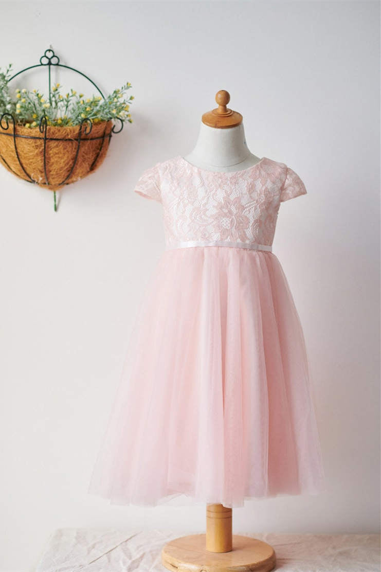 Elegant pink tulle flower girl dress features with cap sleeves, lace top and button back.