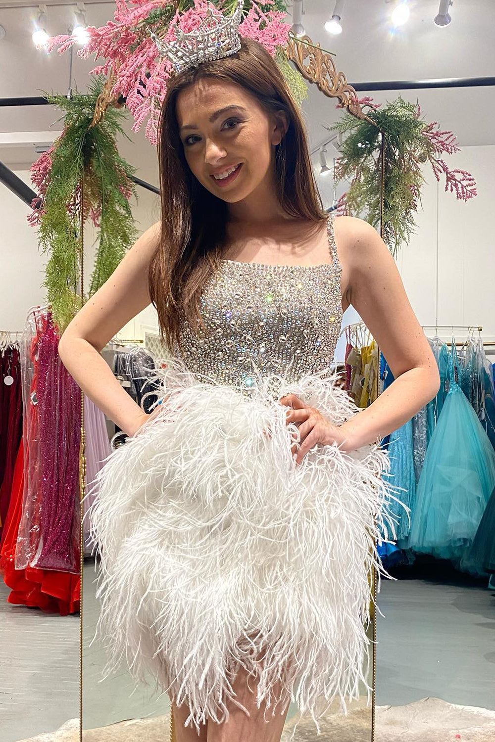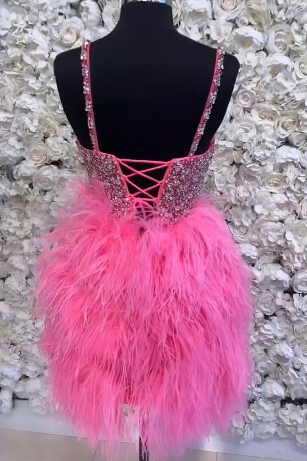 Fancyvestido this hot pink homecoming dress features spaghetti straps, a fitted bodice adorned with beads, a feather skirt, and a zipper back.