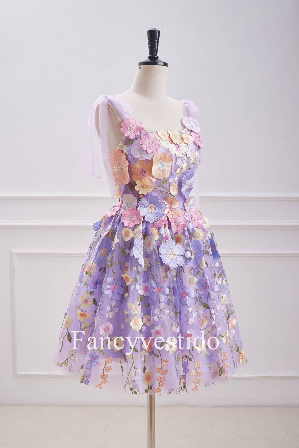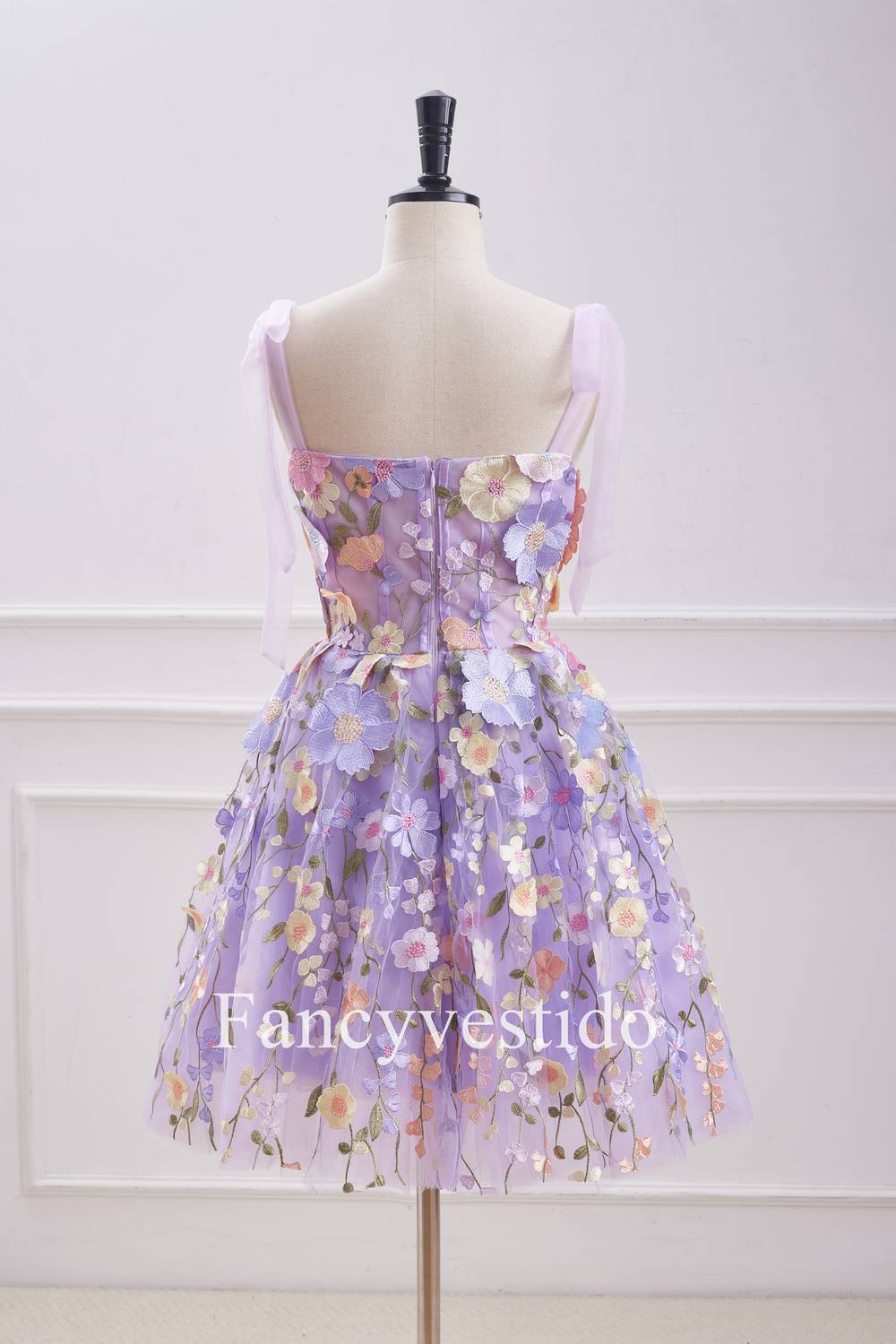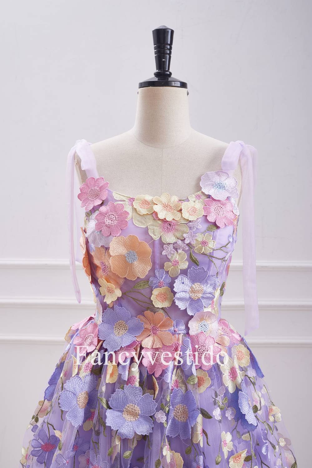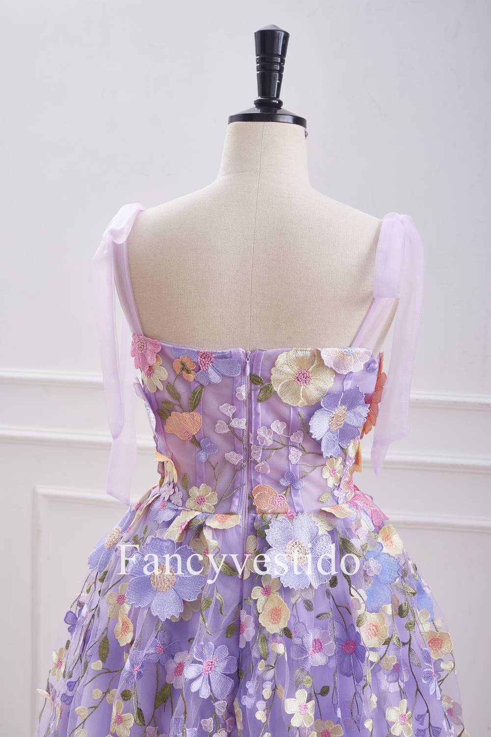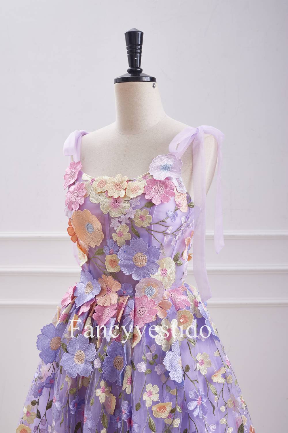 Lavender Floral Lace Up 3D Flowers Back Zip Party Dress