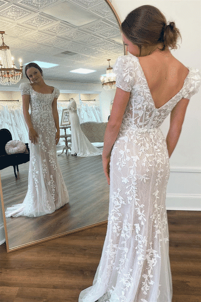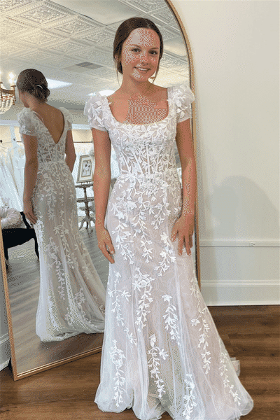 Fancyvestido this prom dress features a square neckline and a plunging V back, puff sleeves, a corset bodice with floral embroidered appliques flowing down to the hemline, and a mermaid silhouette with floor length skirt.