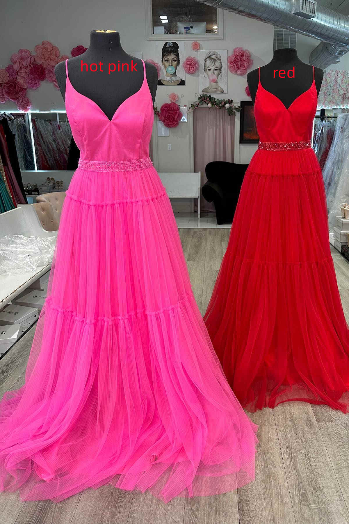 This a-line yellow long prom dress features a v-neck with straps, beaded waist, and a zipper back.