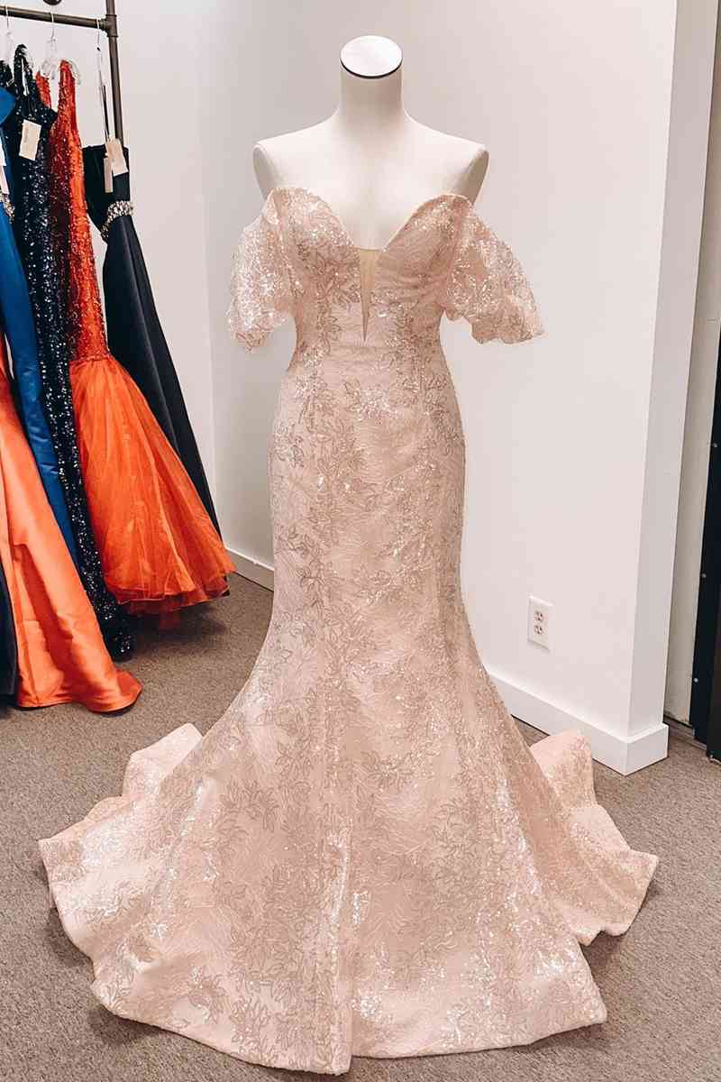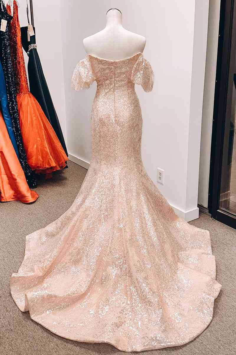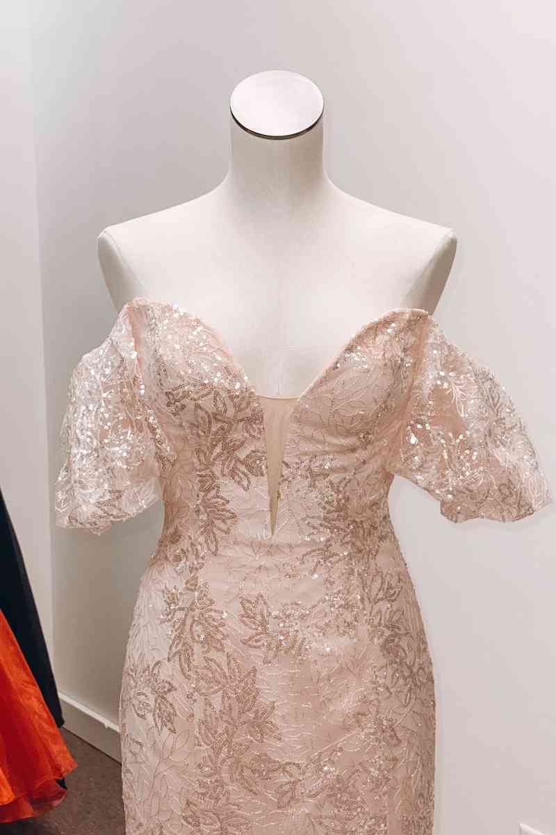 Fancyvestido this light blue long prom dress features sweetheart neckline, puff sleeves, sequins appliques and zipper back.