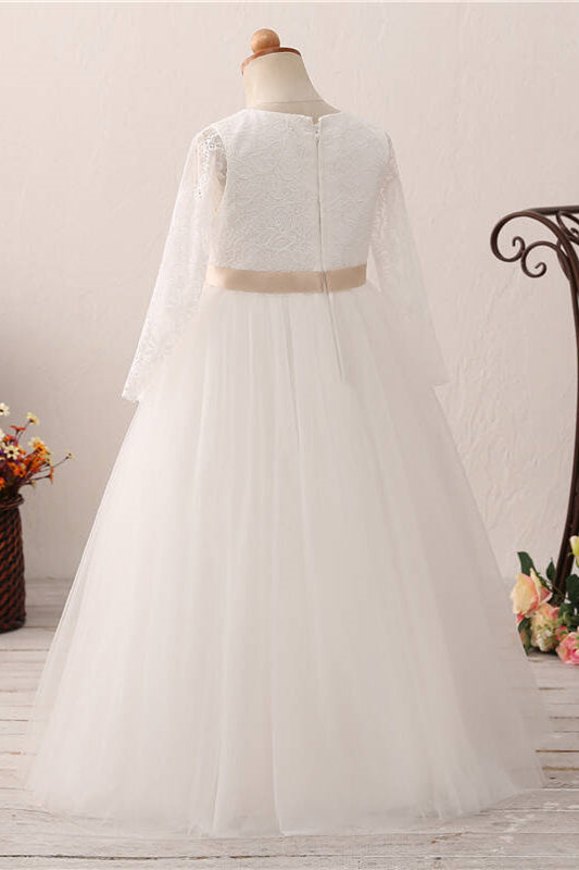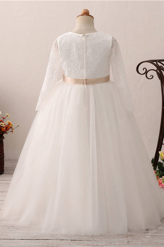 Long Slweeves Tulle and Lace White Flower Girl Dress with Bow