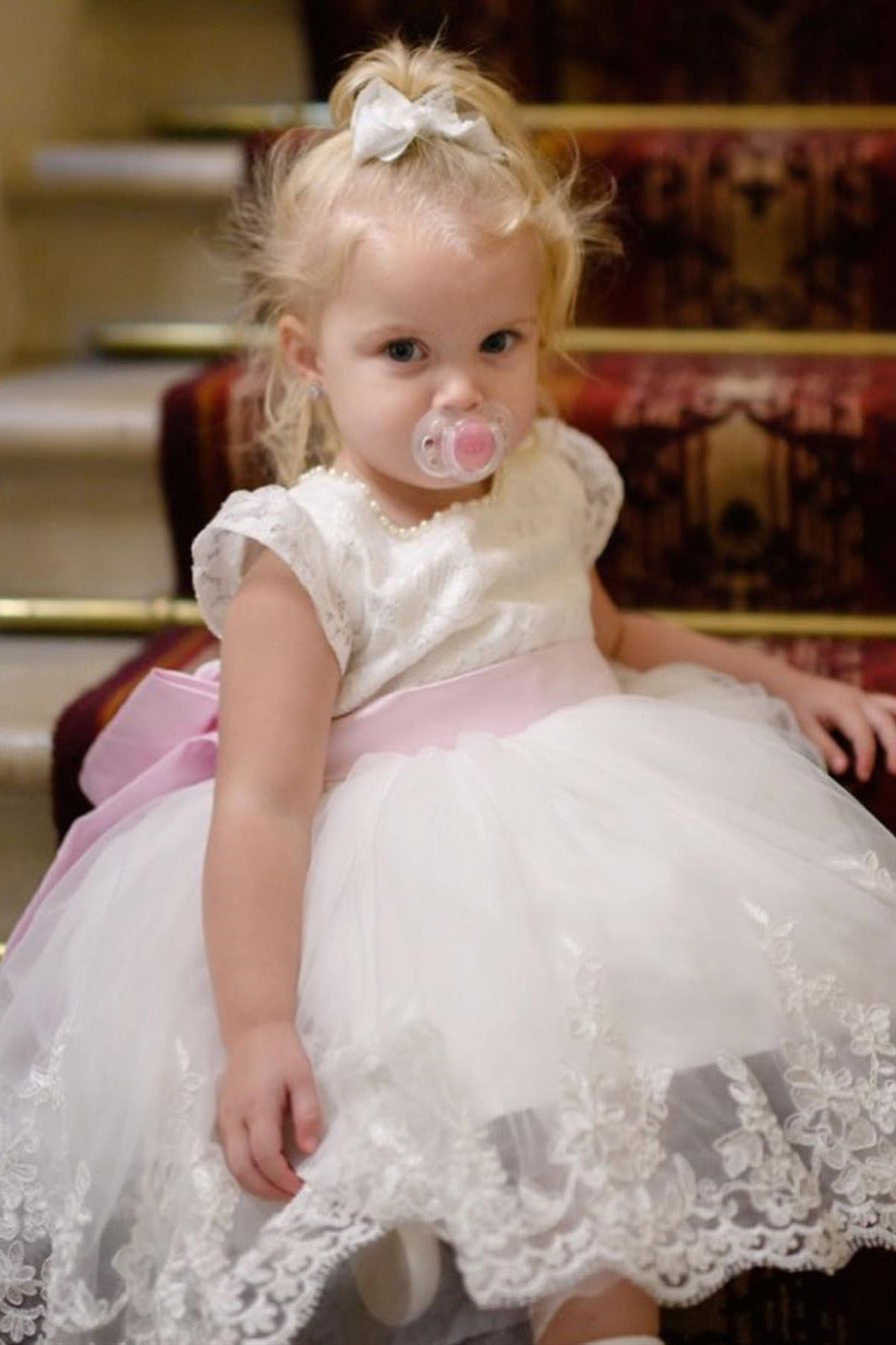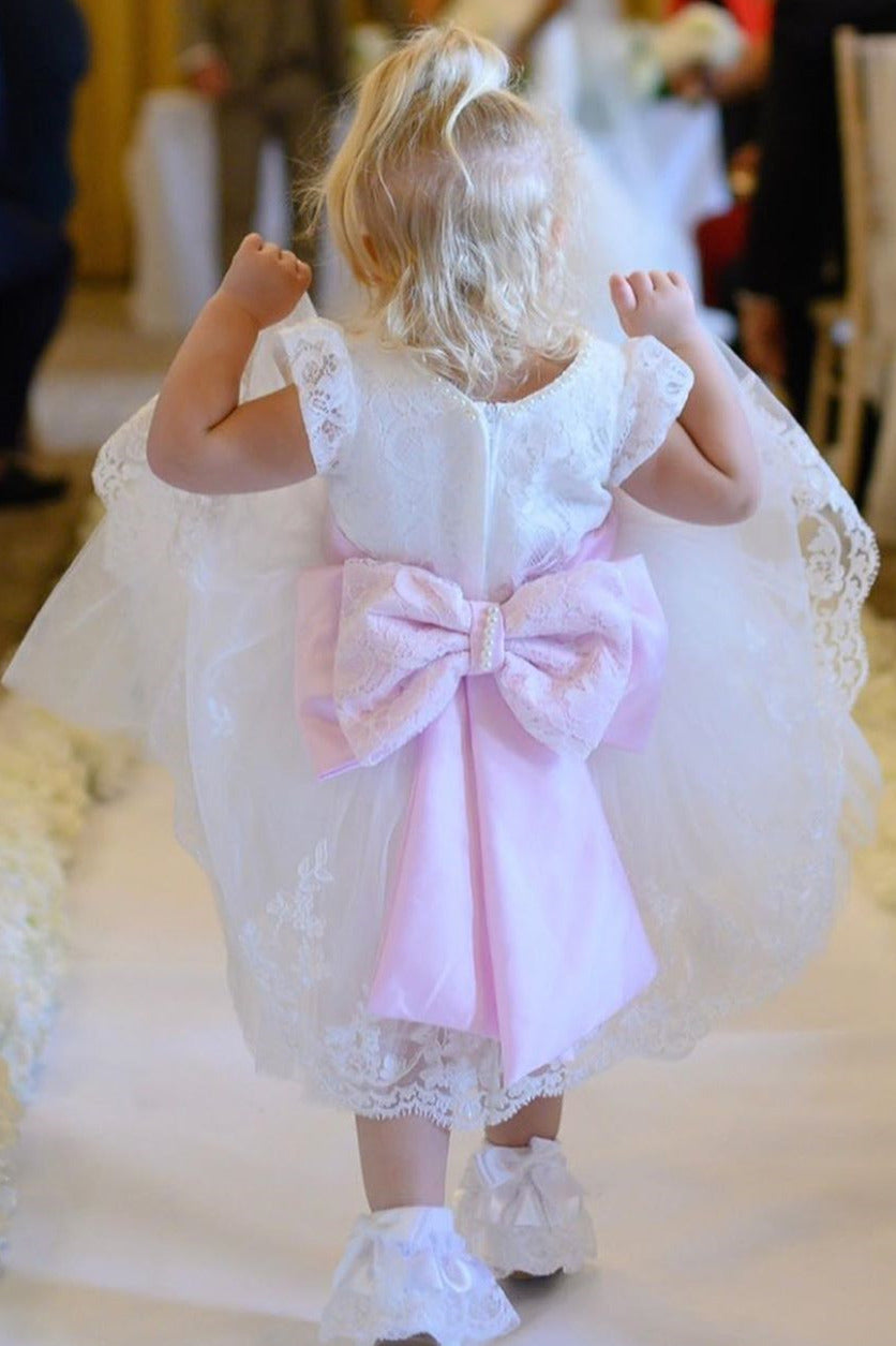 Lovely toddler white flower girl dress with lace appliques, short lace sleeves and pink bowknot.