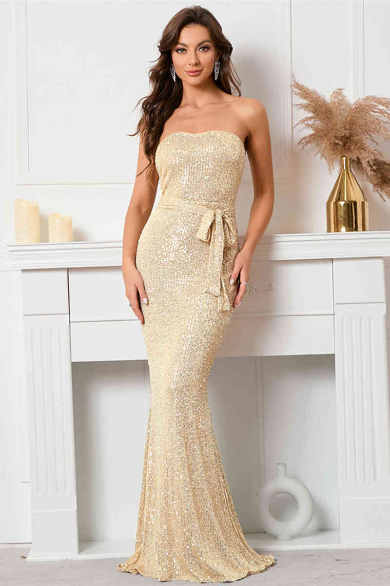 Elegant champagne long evening dress features with sweetheart neckline, sequins and belt.