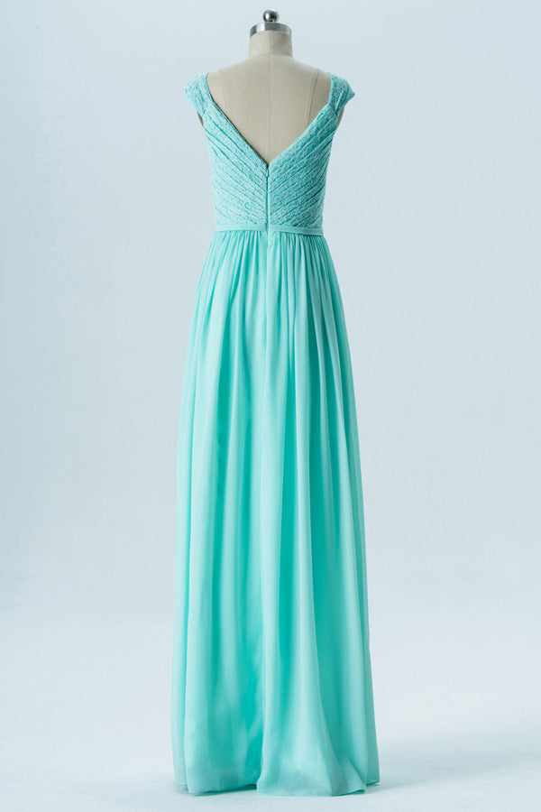 Elegant mint green long bridesmaid dress features with cap sleeves, pleated bodice and zipper back.