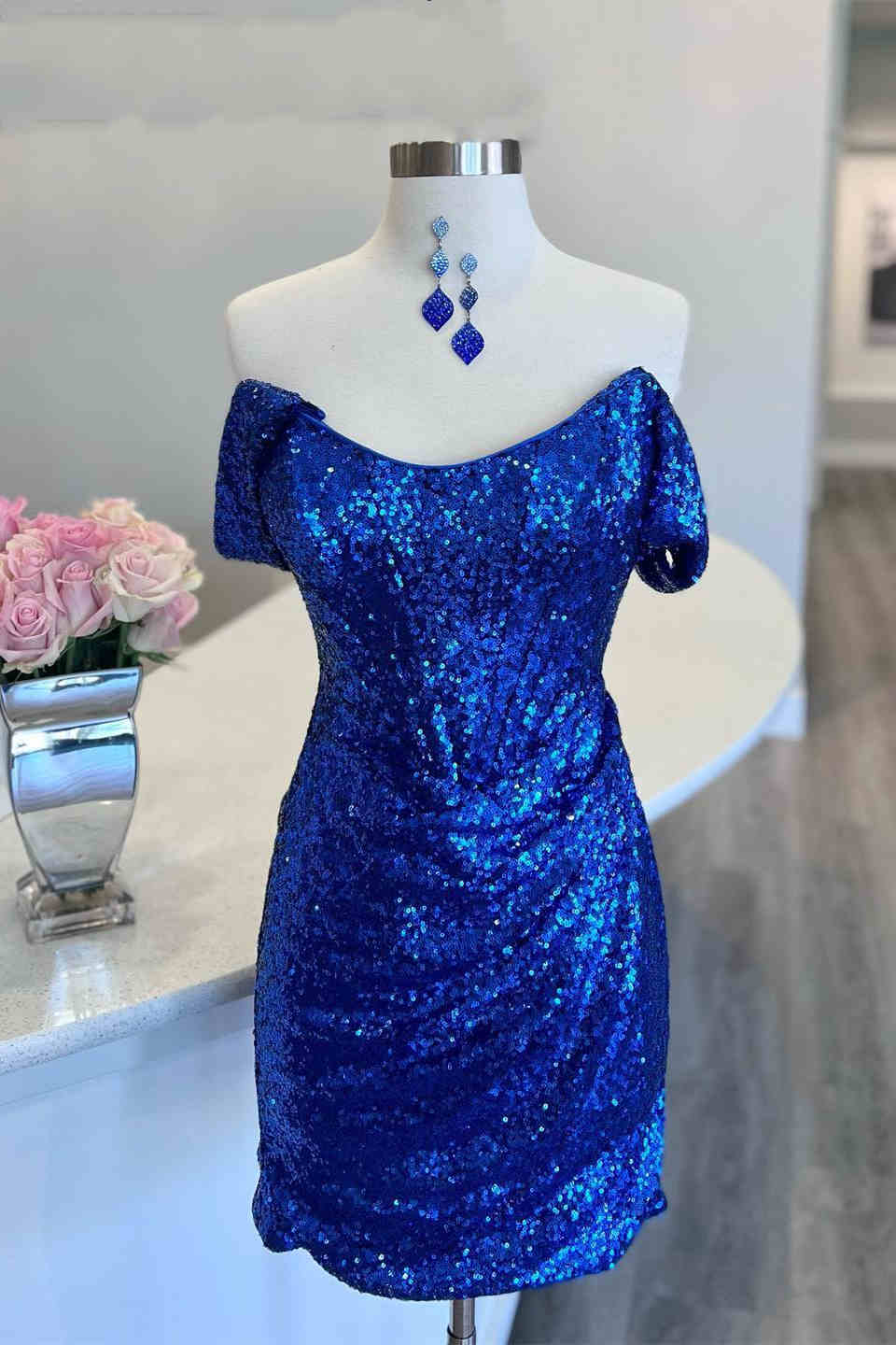 Neon Pink Off the Shoulder Sequined Bodycon Homecoming Dress