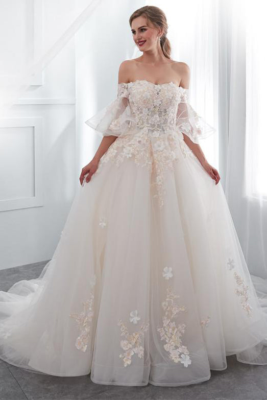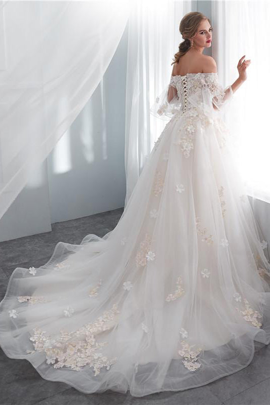 Princess Long Off Shoulder A-line Ivory Bridal Dress with Appliques