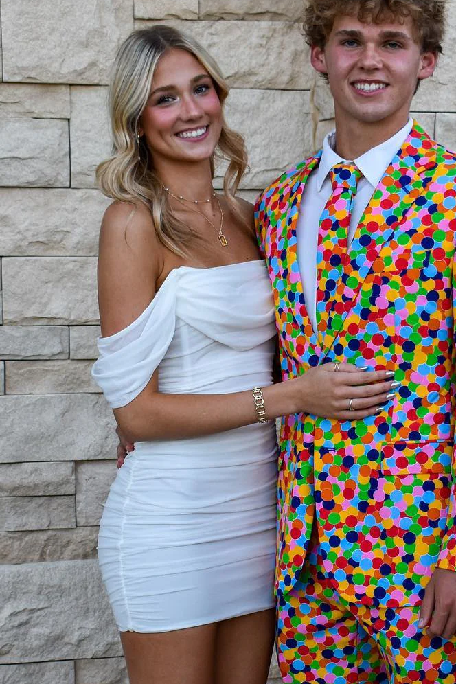 This short homecoming dress features a fitted tulle fabric with ruched detailing and an off-the-shoulder neckline, offering a sleek and elegant silhouette perfect for formal occasions.