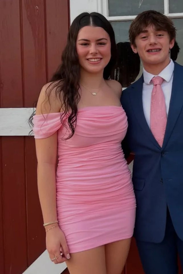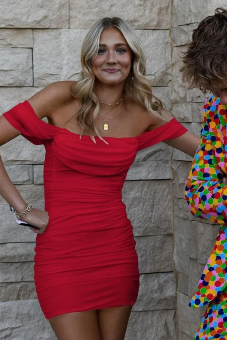 Off Shoulder Ruched Tight Tulle Short Homecoming Dress
