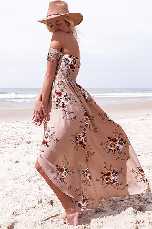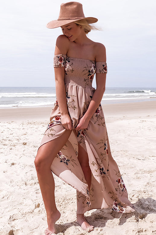 Off Shoulder Super-Elastic White Floral Summer Dress with Slit