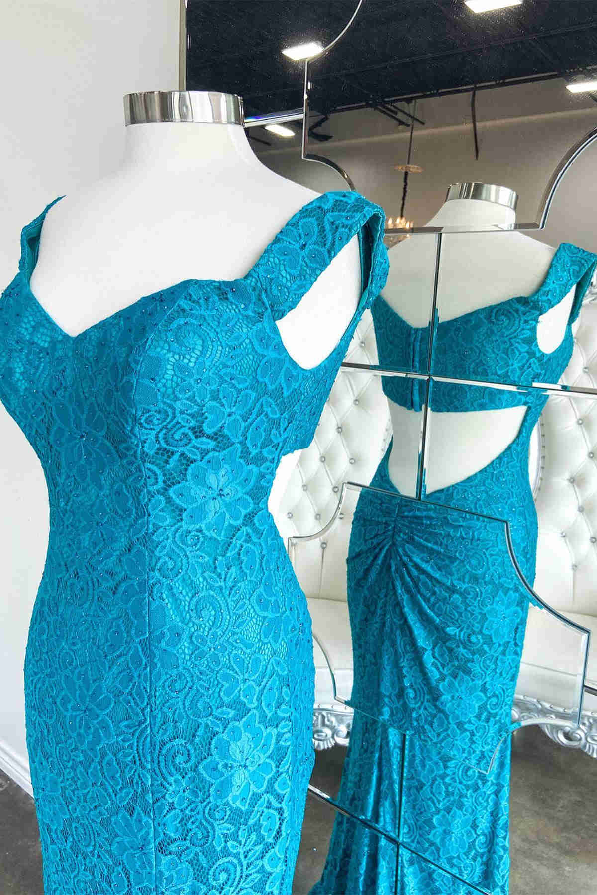 Elegant blue long prom dress features off the shoulder neckline, lace and zipper back . Elegant and stunning, it will be your best choice for prom.
