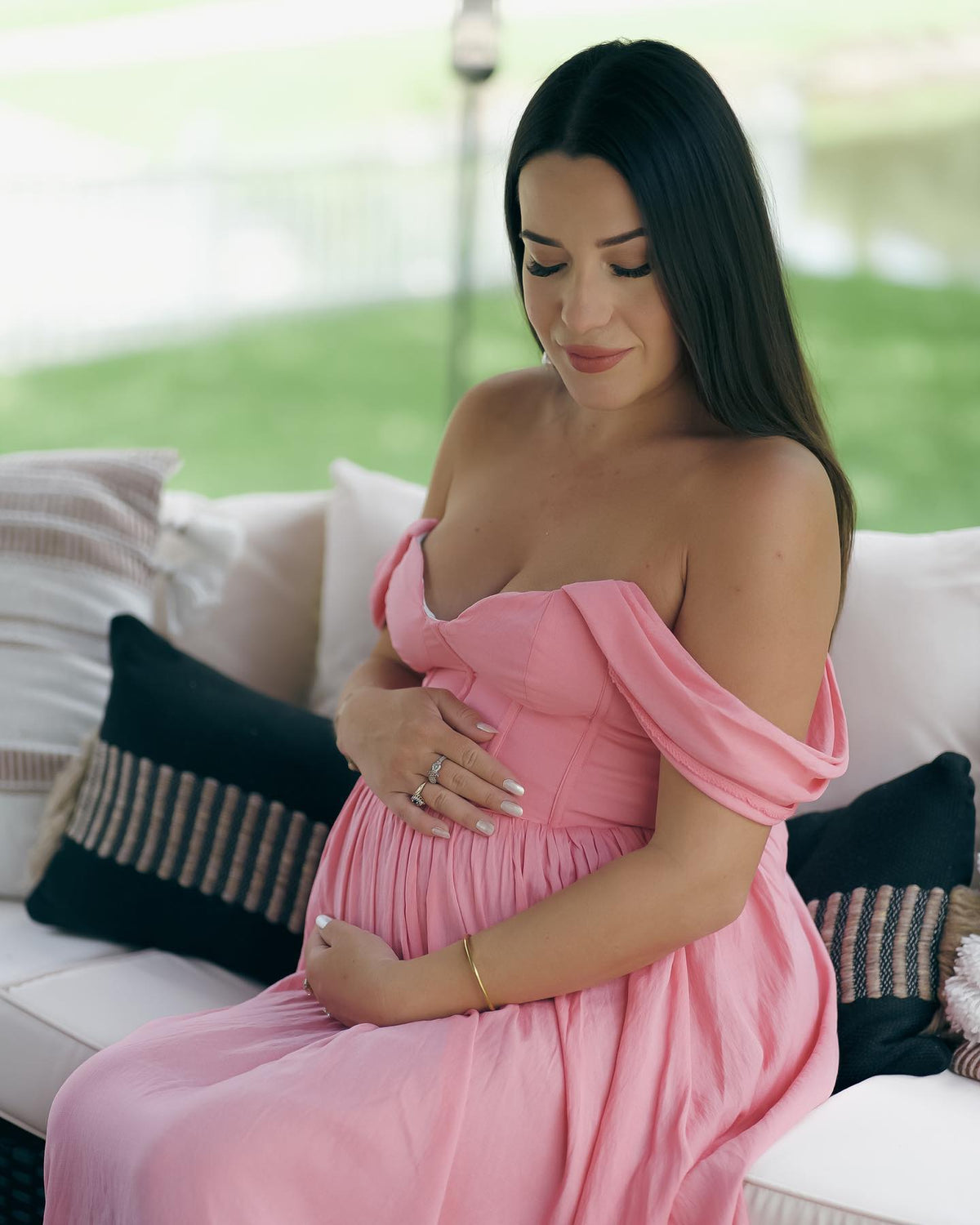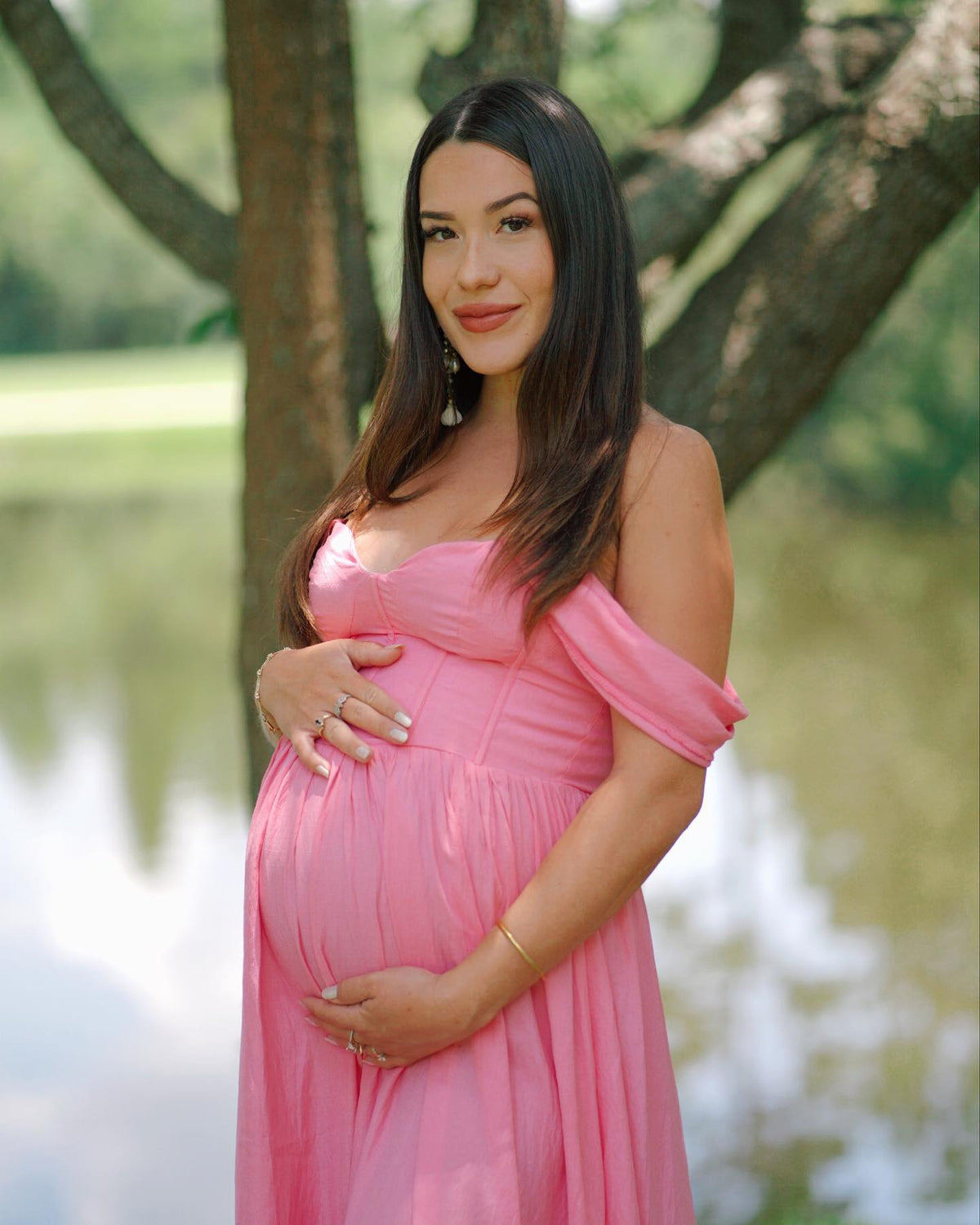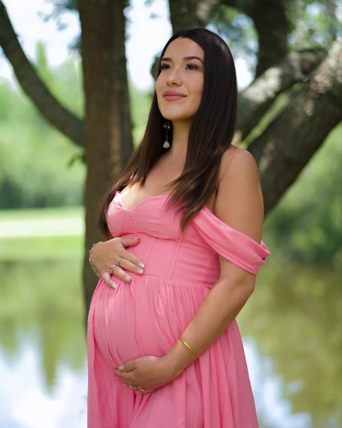 Off the Shoulder Pink Floor Length Pregnant Bridesmaid Dress