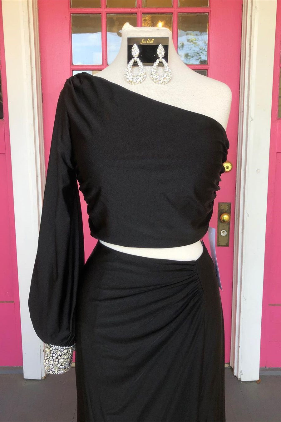 One Shoulder Black Long Dress Two Piece Prom Dress