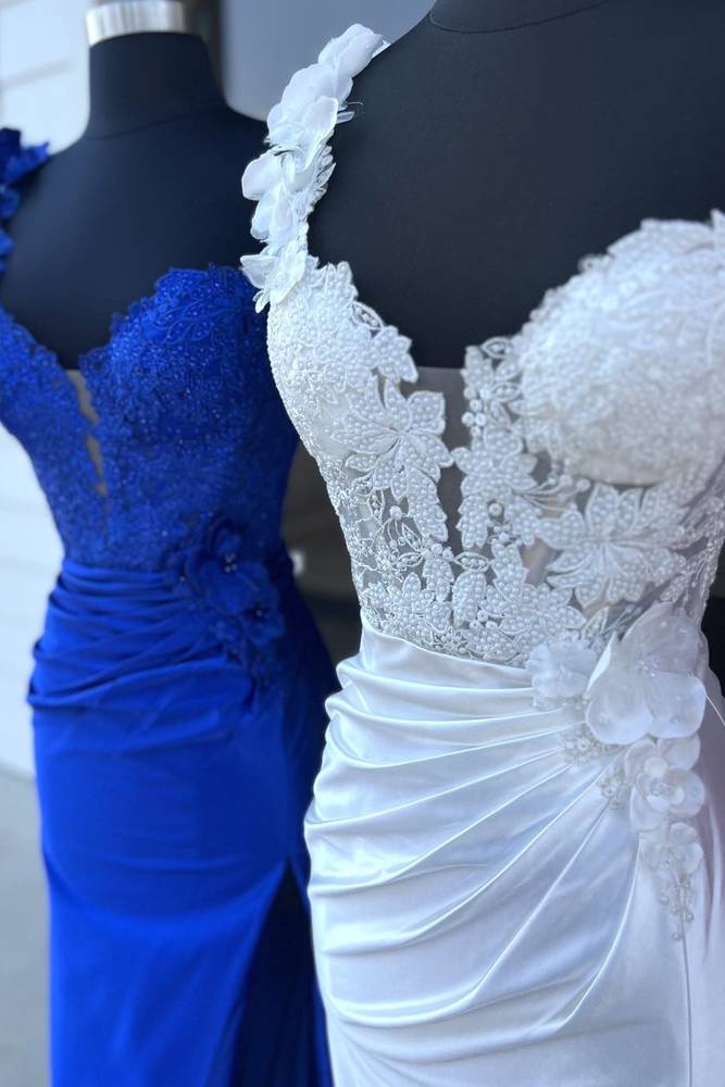 This fuchsia gown is expertly featured with a one-shoulder strap, lace corset bodice, and intricate flower embellishments. The ruched waist and mermaid skirt create a flattering silhouette, making you stand out on your special night. Embrace elegance and confidence with this stunning dress.