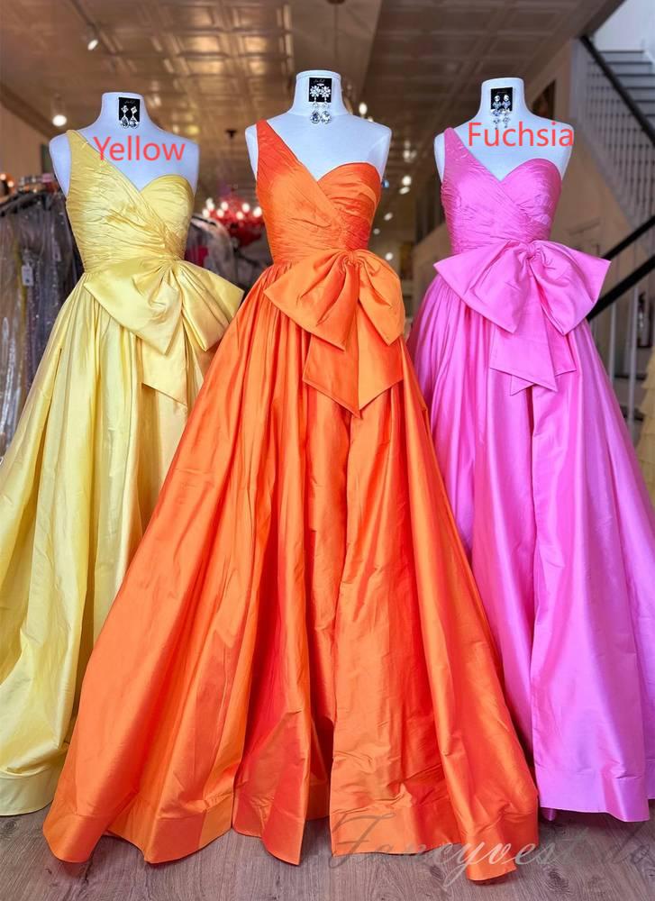 One Shoulder Orange Pleated A-Line Prom Dress with Bow