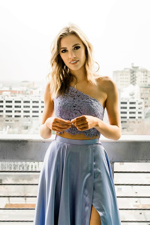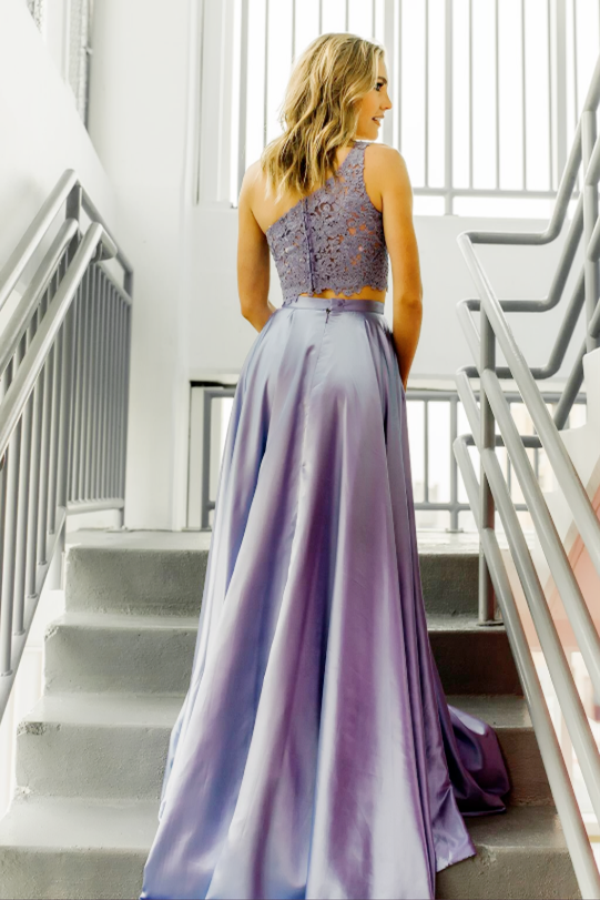 One Shoulder Yellow Two Piece Prom Dress with Slit