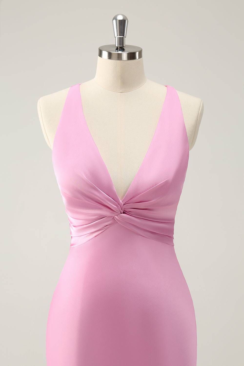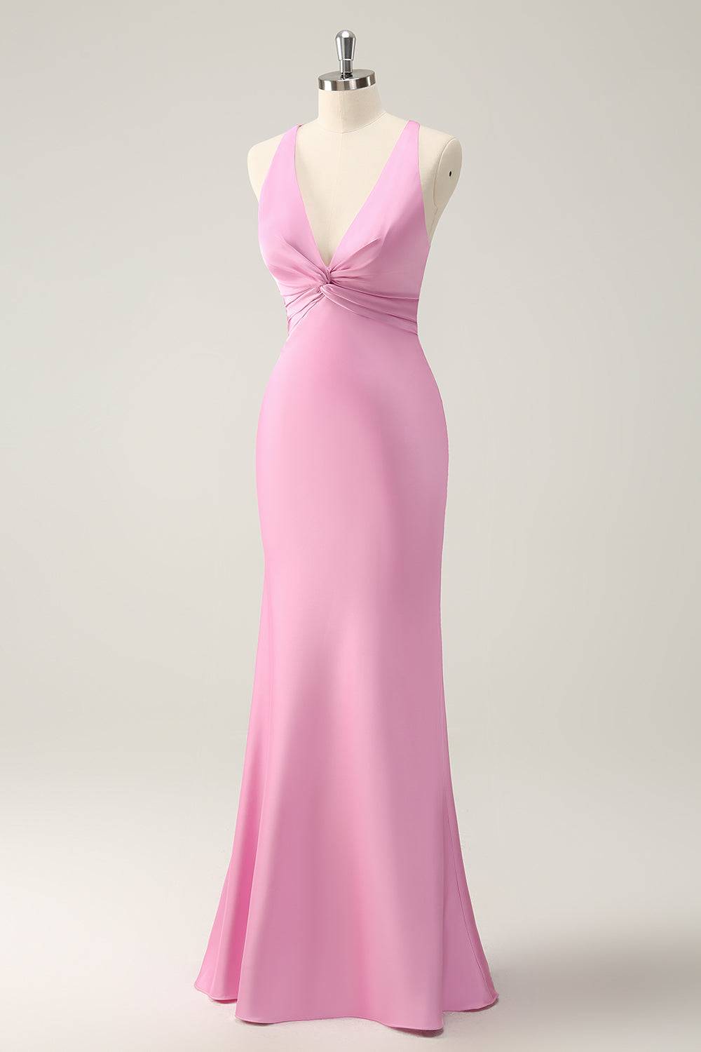 Plunging Neck Pink Twist Mermaid Maxi Dress