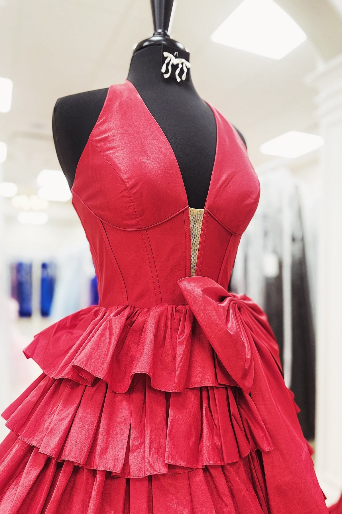Plunging Neck Ruffle Slit Prom Dress with Bow