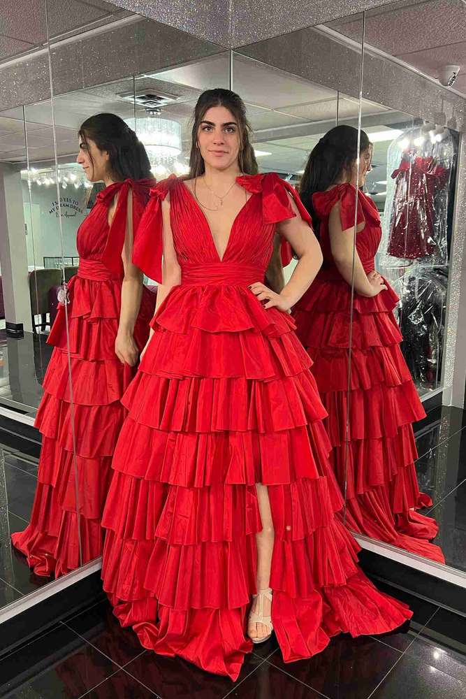 This stunning fuchsia ball gown features delicate bow straps and a tiered a-line skirt with a side slit. The bold fuchsia color adds a pop of color, while the ruffled design offers a fun touch. Perfect for any special occasion, this dress will make you stand out and turn heads.