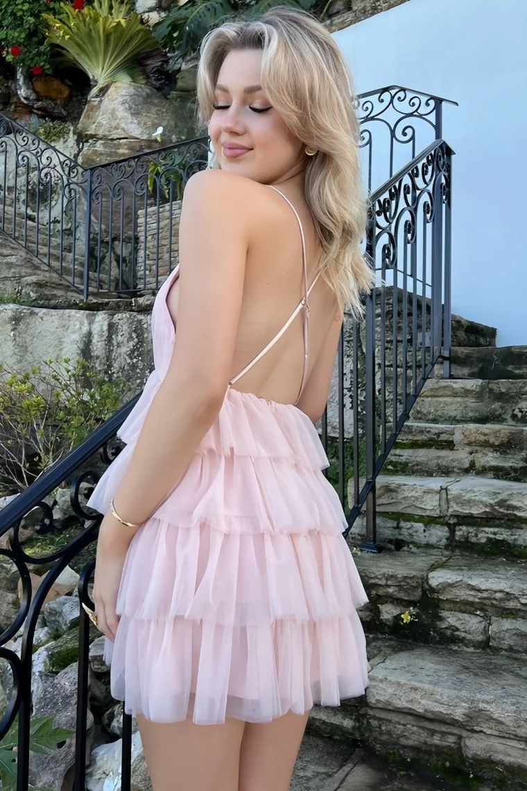 Pluning Neck Ruffle A-Line Homecoming Dress wth Lace-up