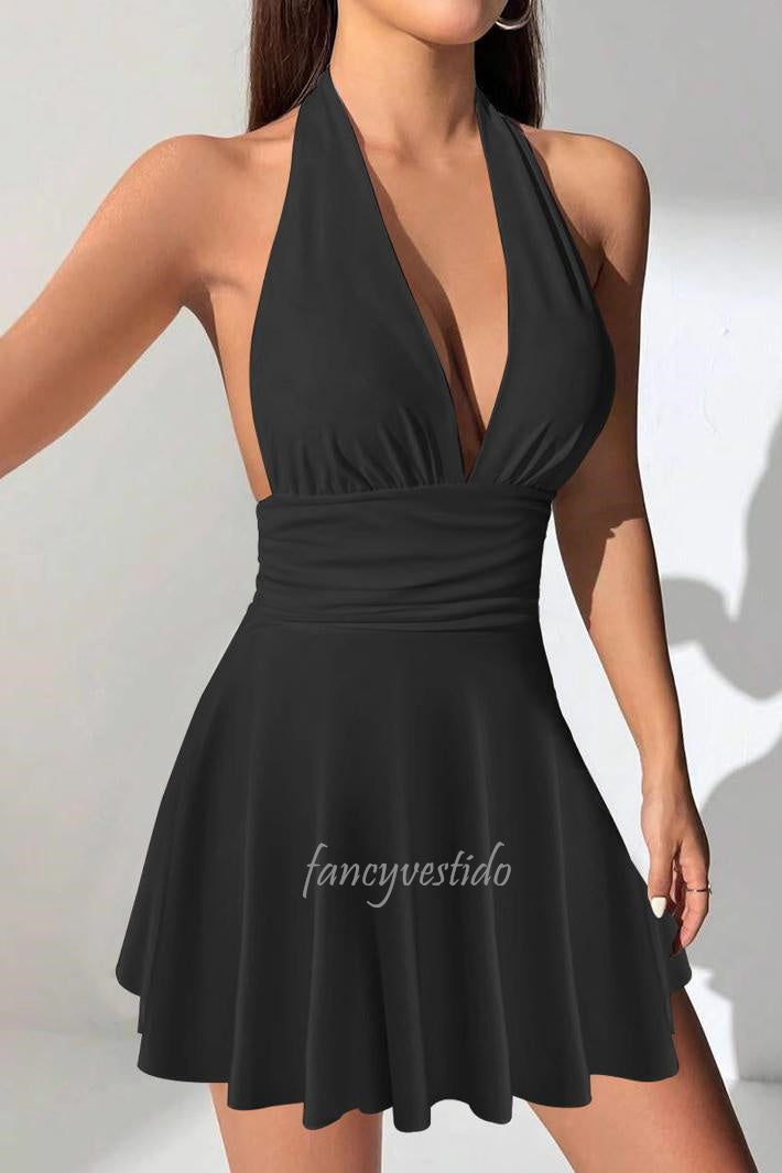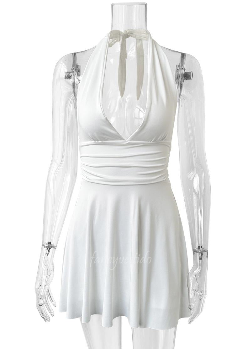 This backless summer dress offers a plunging V-neck design combined with an A-line silhouette, creating a flattering and sophisticated look. Crafted for warm weather, its breathable fabric and open back keep you cool and stylish on beach days or casual outings. The elegant cut highlights your neckline and shoulders, while the flowy shape ensures comfortable movement. Perfect for those seeking a blend of boldness and ease in their summer wardrobe.