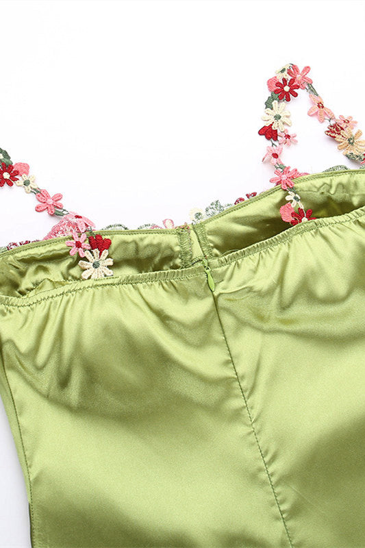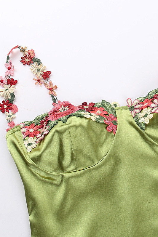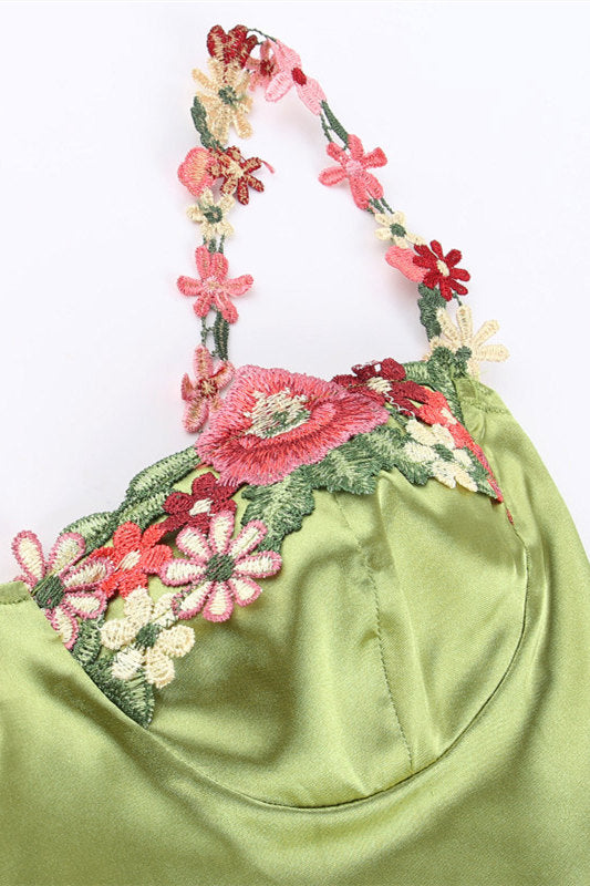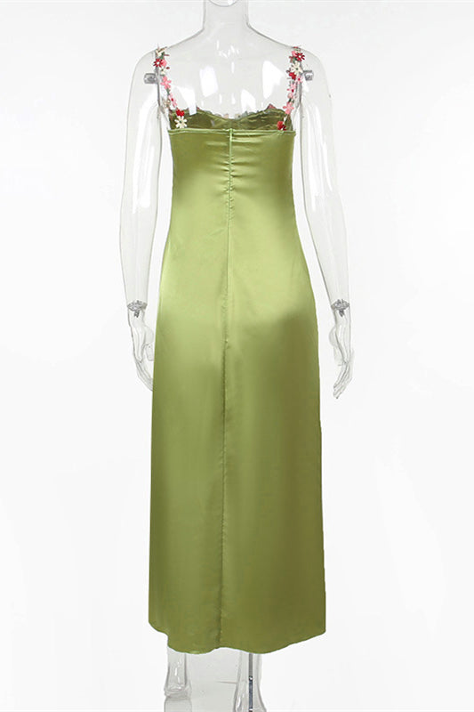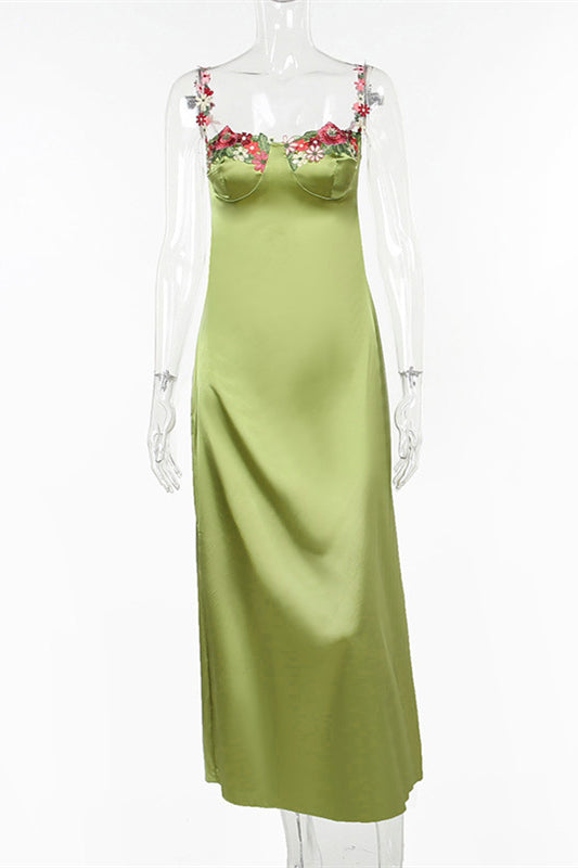 Expertly crafted with delicate floral embroidery, this Princess Green Maxi Dress is a must-have for any fashion-forward individual. The dress features adjustable straps and a zipper back for a comfortable and flattering fit. Perfect for any occasion, this dress is sure to make a statement.
