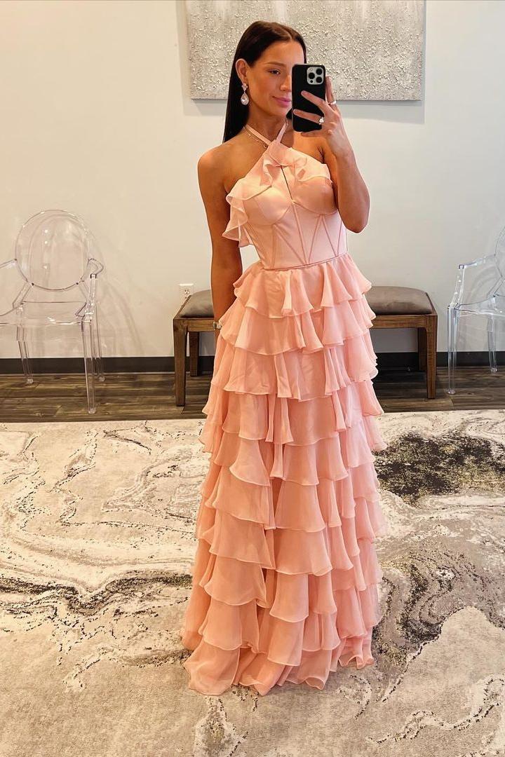 Red Halter Ruffle Tiered Chiffon Prom Dress with Slit