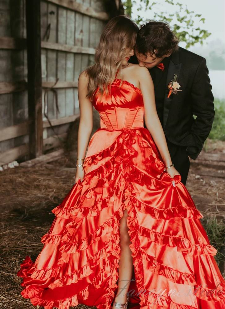 This stunning red prom dress offers a halter neckline and a beautiful ruffle tiered skirt, with a daring slit that adds an alluring touch. The perfect combination of sophistication and sexiness, this dress is sure to turn heads and make you stand out.