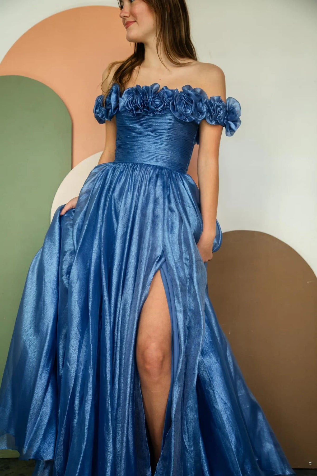 Expertly crafted with a flattering A-line silhouette, this royal blue prom dress features delicate pleats and an elegant off-shoulder design adorned with a charming flower. The regal color and stylish details create a timeless look that will make you stand out at any prom or formal event.