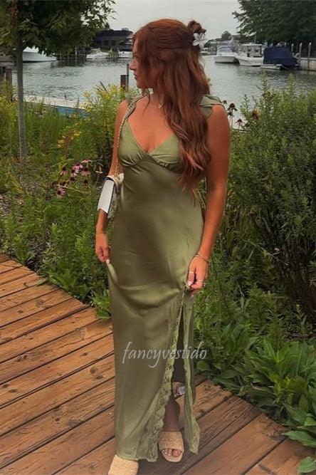 Ruffle Straps V-Neck M Prom Dress with High Slit