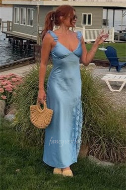 This mermaid prom dress features a flattering V-neckline and delicate ruffle straps that add feminine charm. The fitted silhouette elegantly contours the body before flowing into a dramatic high slit, offering both sophistication and ease of movement. Perfectly balanced between classic design and contemporary details, this gown ensures a graceful and memorable look for any formal occasion.