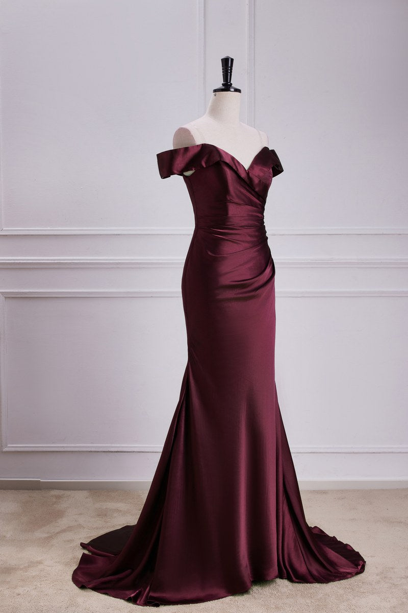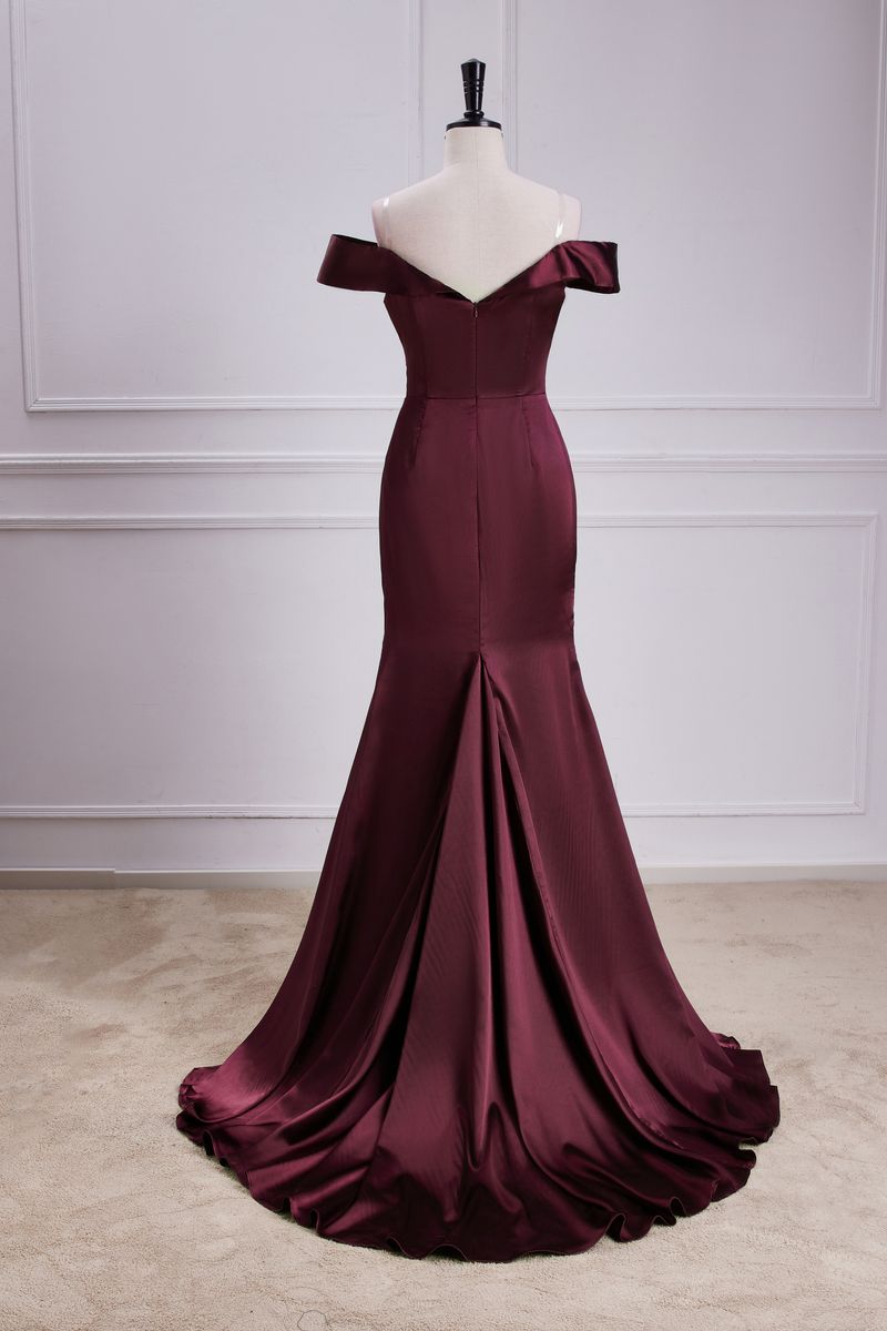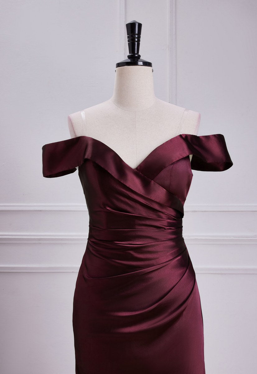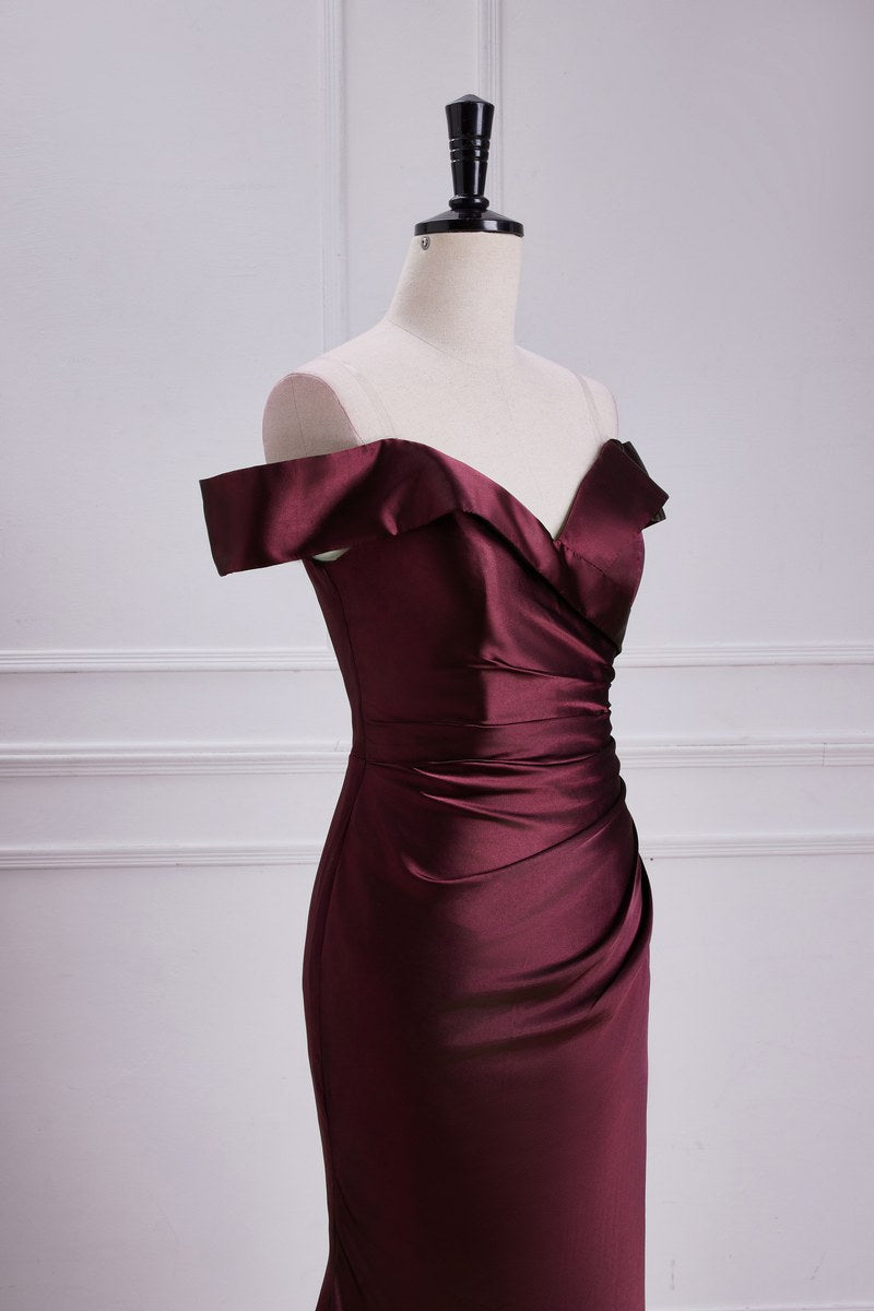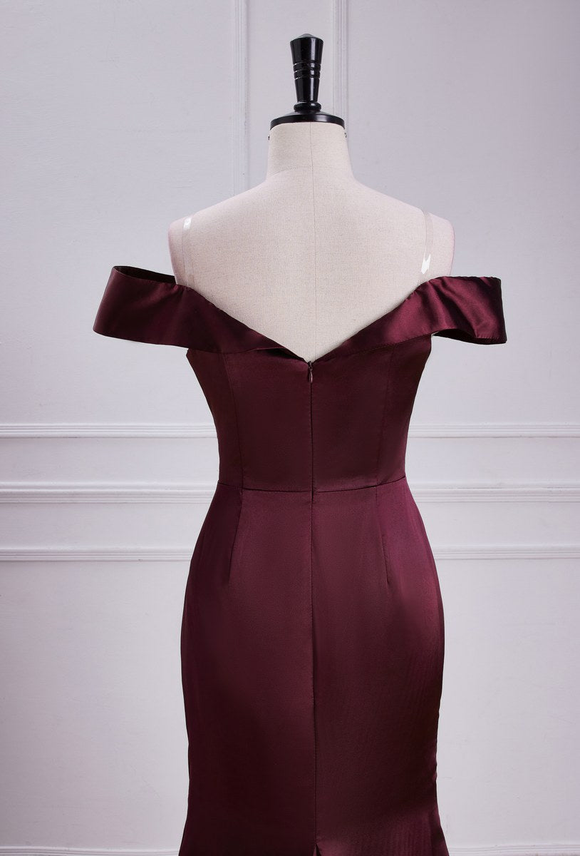 Burgundy Off-The-Shoulder Satin Mermaid Bridesmaid Dress