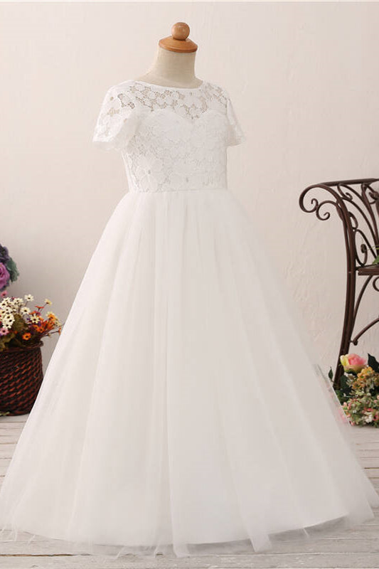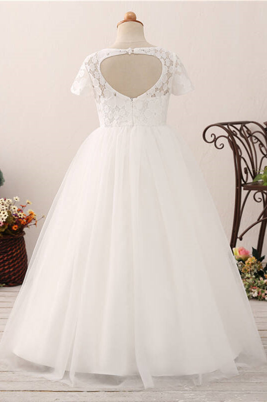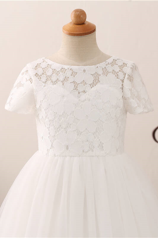 Short Sleeves Lace and Tulle White Flower Girl Dress
