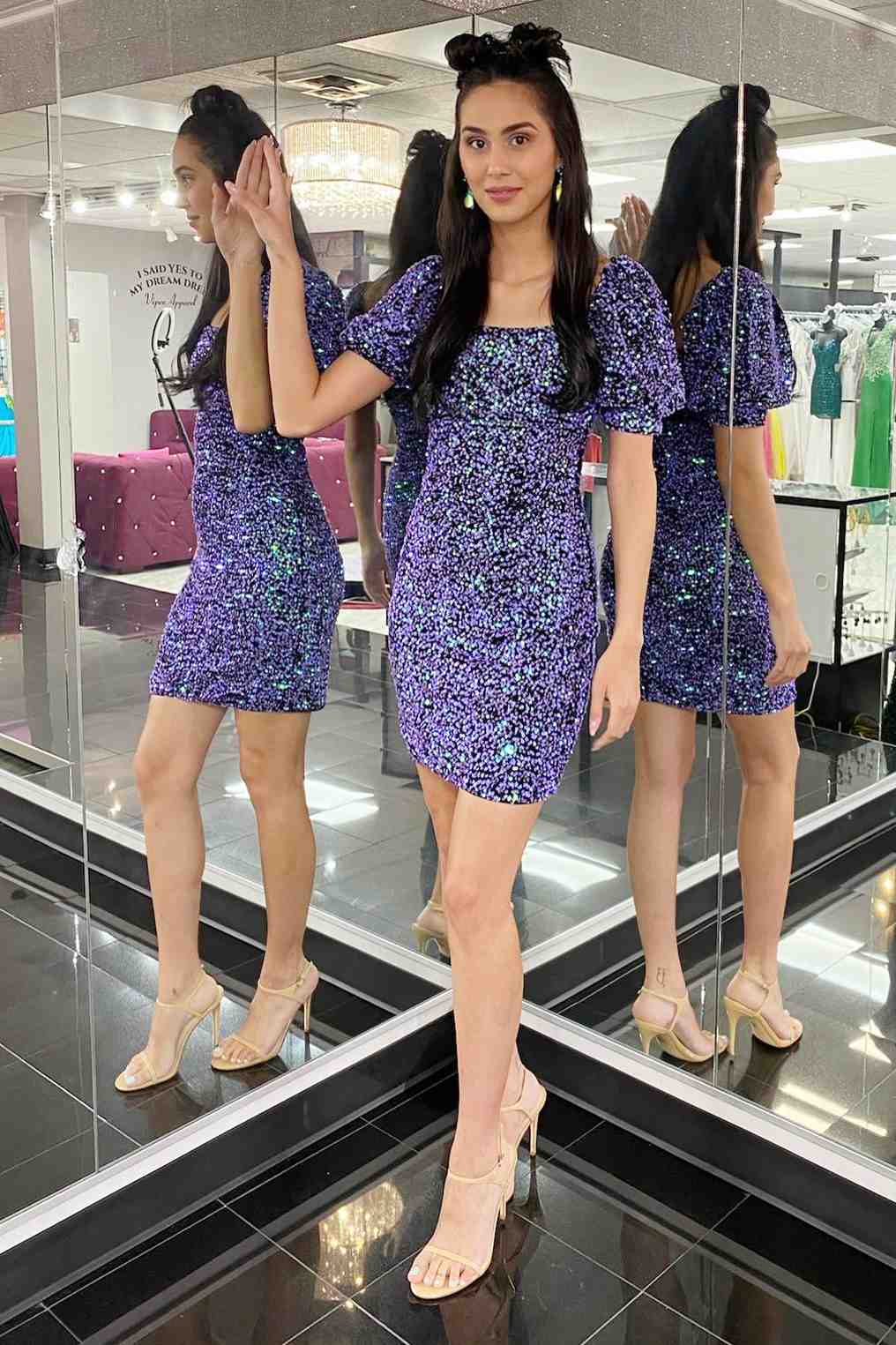 This tight purple short homecoming dress features square neck, short sleeves and zipper back.