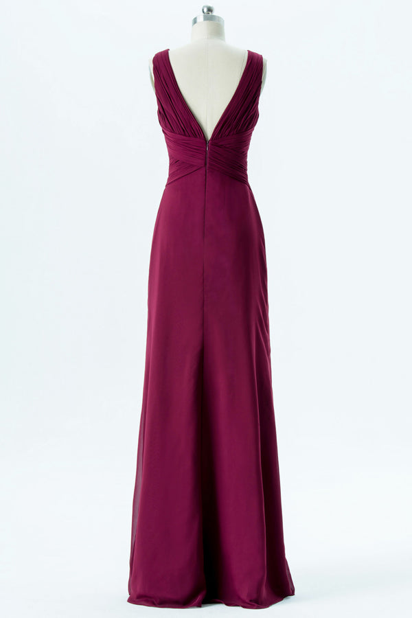 Elegant berry a-line long bridesmaid dress features with v-neck, pleated bodice and zipper back.