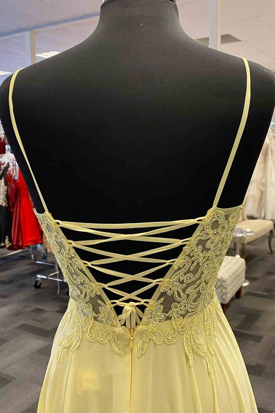 Spaghetti Straps Yellow Chiffon Prom Dress with Appliques