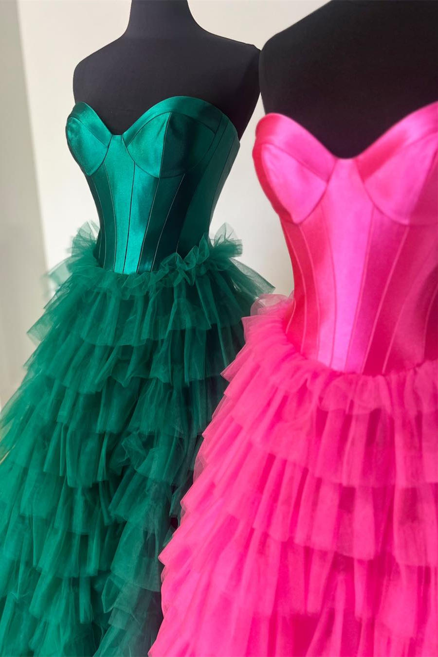 Strapless Black Corset A-Line Layered Prom Dress with Slit