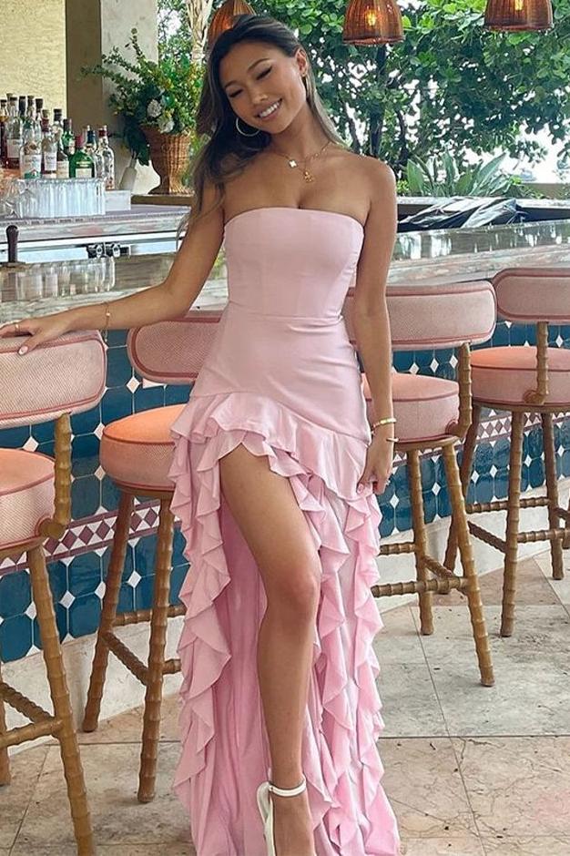 Strapless Black Ruffle High Slit Prom Dress