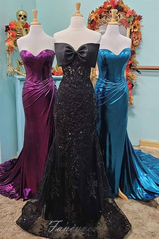 Strapless Blue Applique Mermaid Prom Dress with Bow