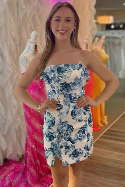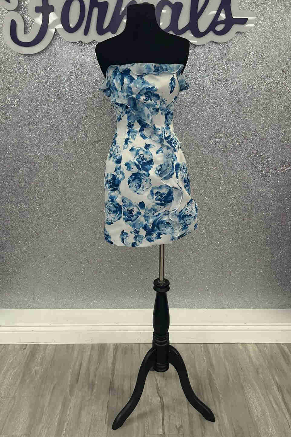 Strapless Blue Floral Print Mini Dress with Ruffles