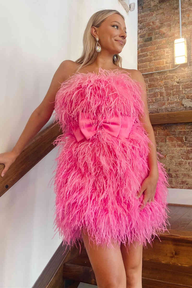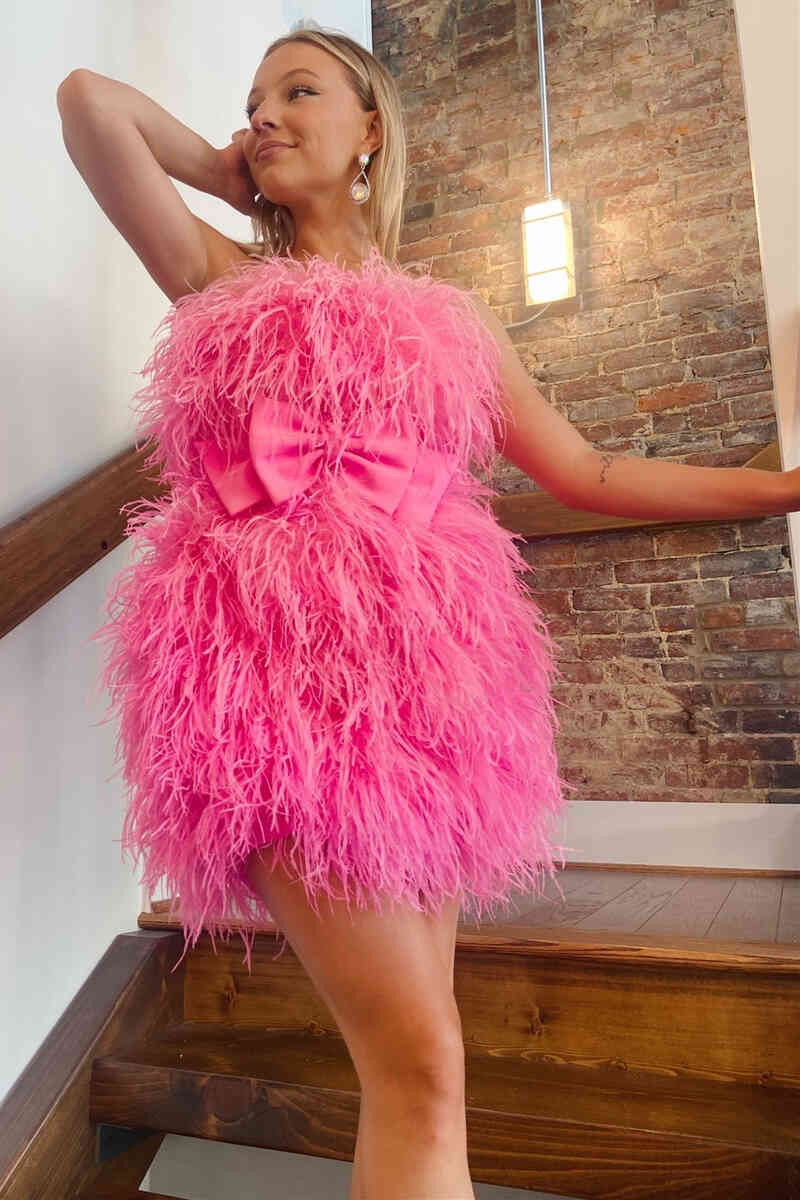 Strapless Hot Pink Feather Short Party Dress with Bow