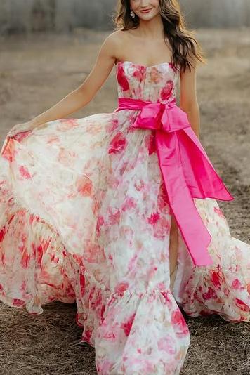 Strapless Lavender Floral Print Long Prom Dress with Bow Sash