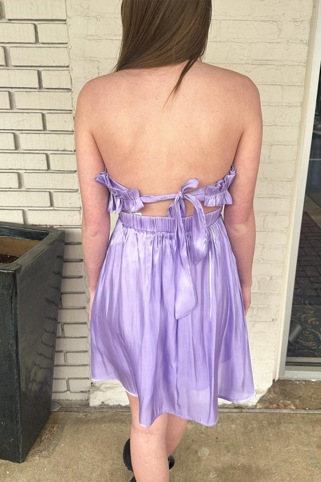 Fancyvestido this short lavender homecoming dress features a strapless neckline with ruffles, and tie back.
