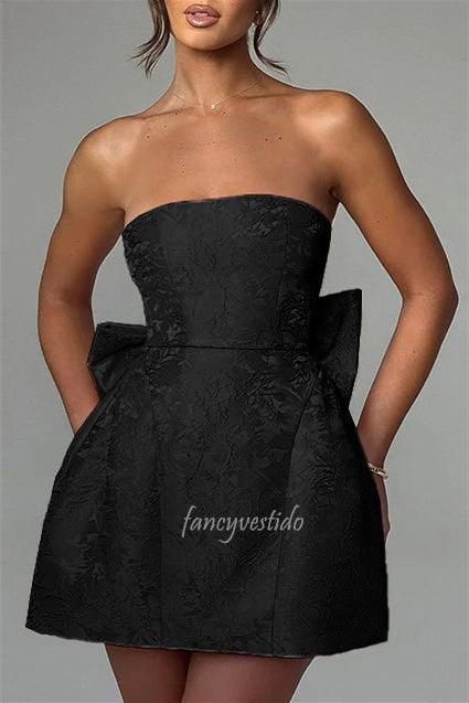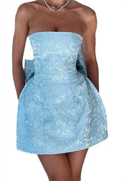This strapless pink brocade dress combines elegant texture with a flattering silhouette, perfect for graduation or homecoming events. The structured bodice provides support without straps, while the delicate bow at the waist adds a refined, feminine touch. Crafted from luxurious brocade fabric, it offers both visual interest and durability, ensuring you stand out confidently at your special occasion.