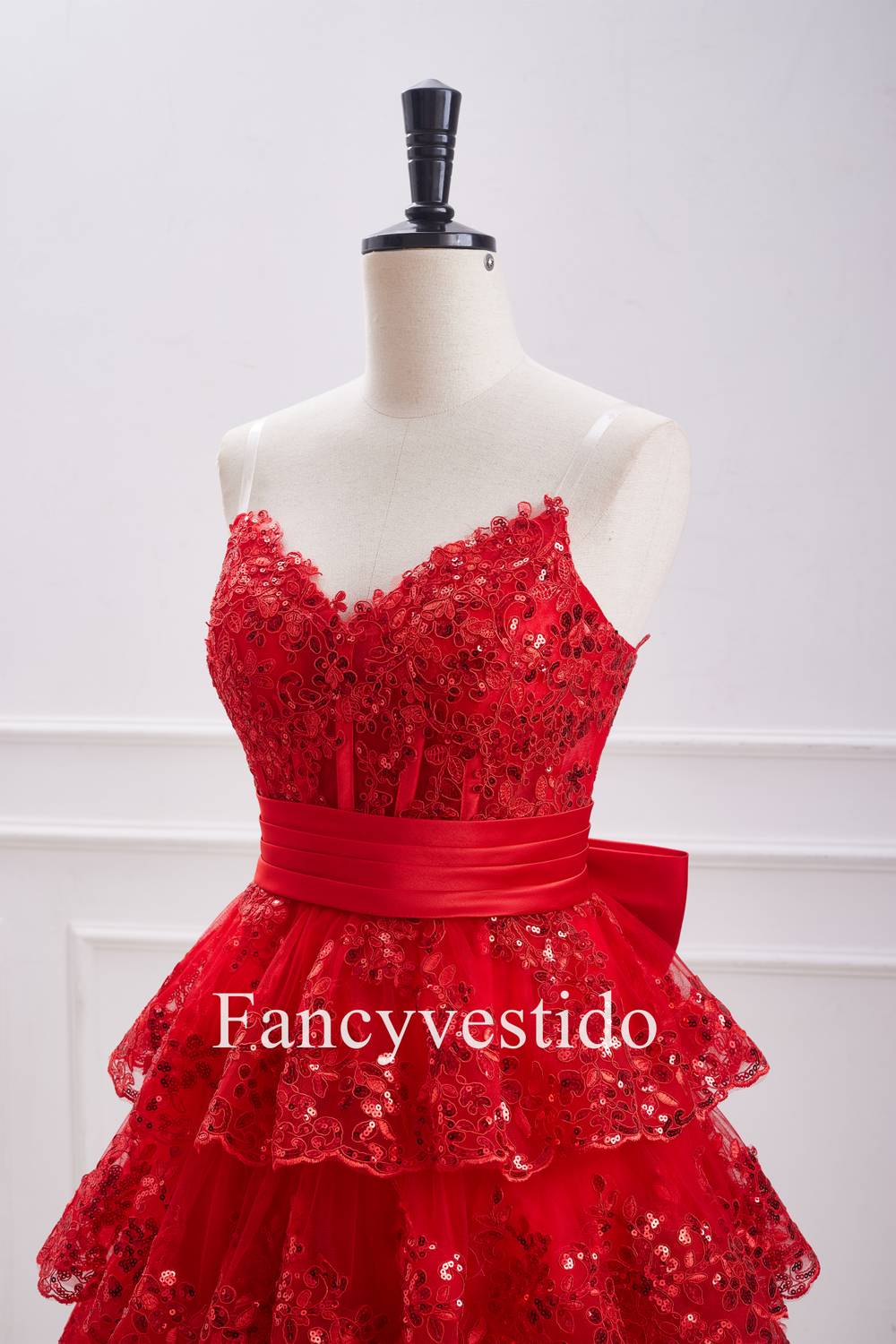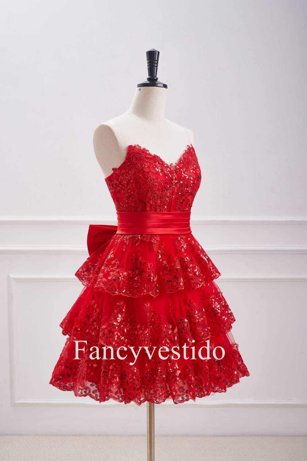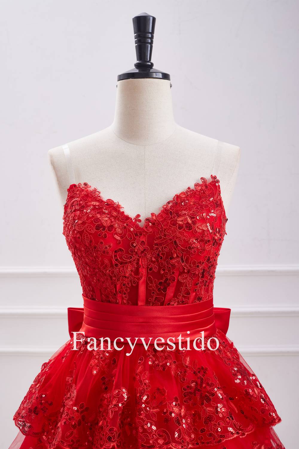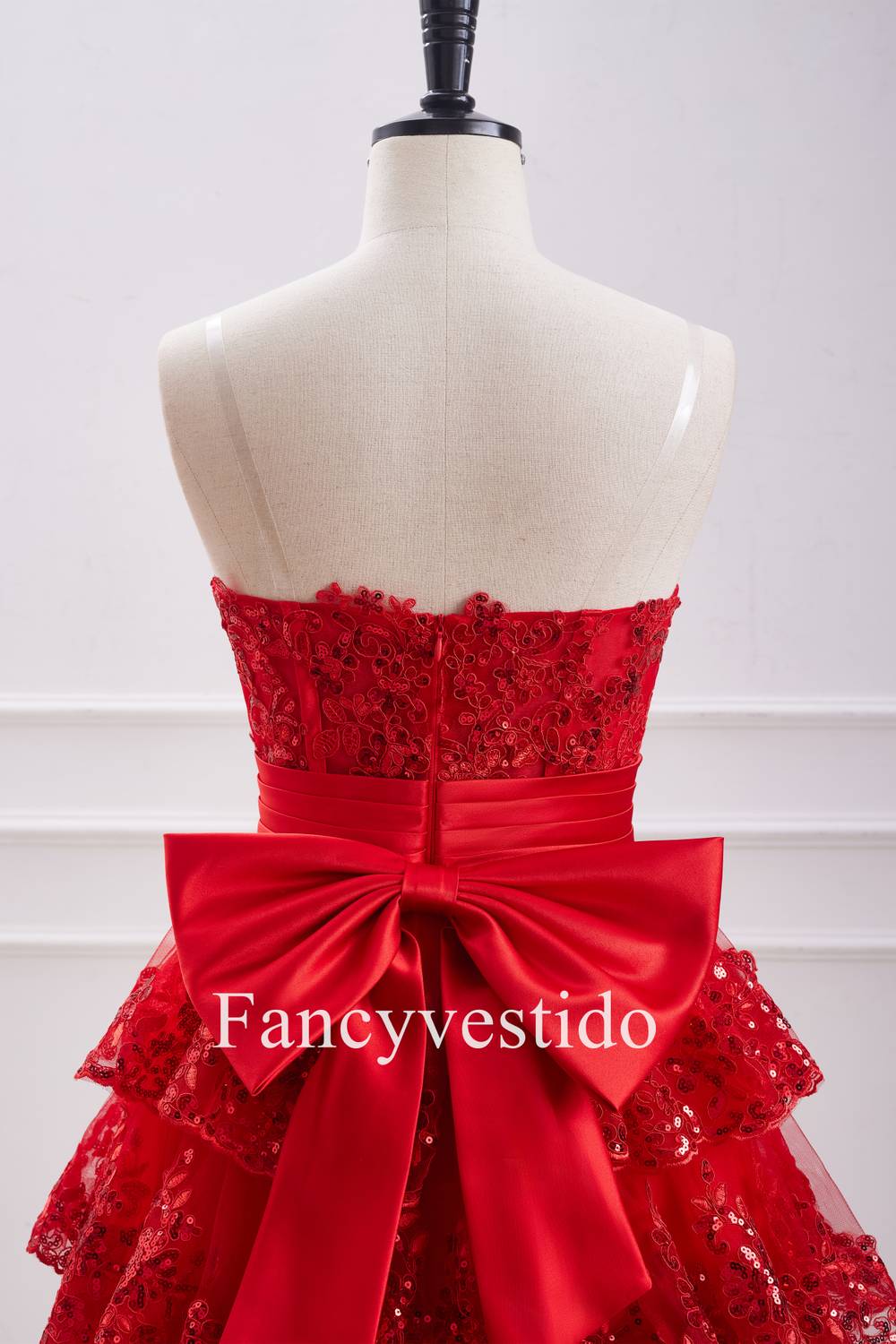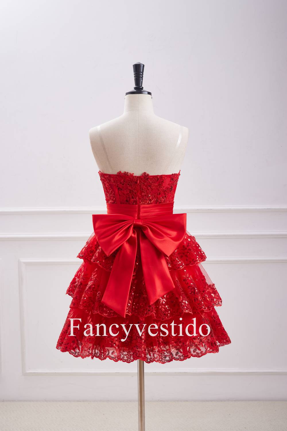 Strapless Red Corset Sequin Ruffle Homecoming Dress with Bow