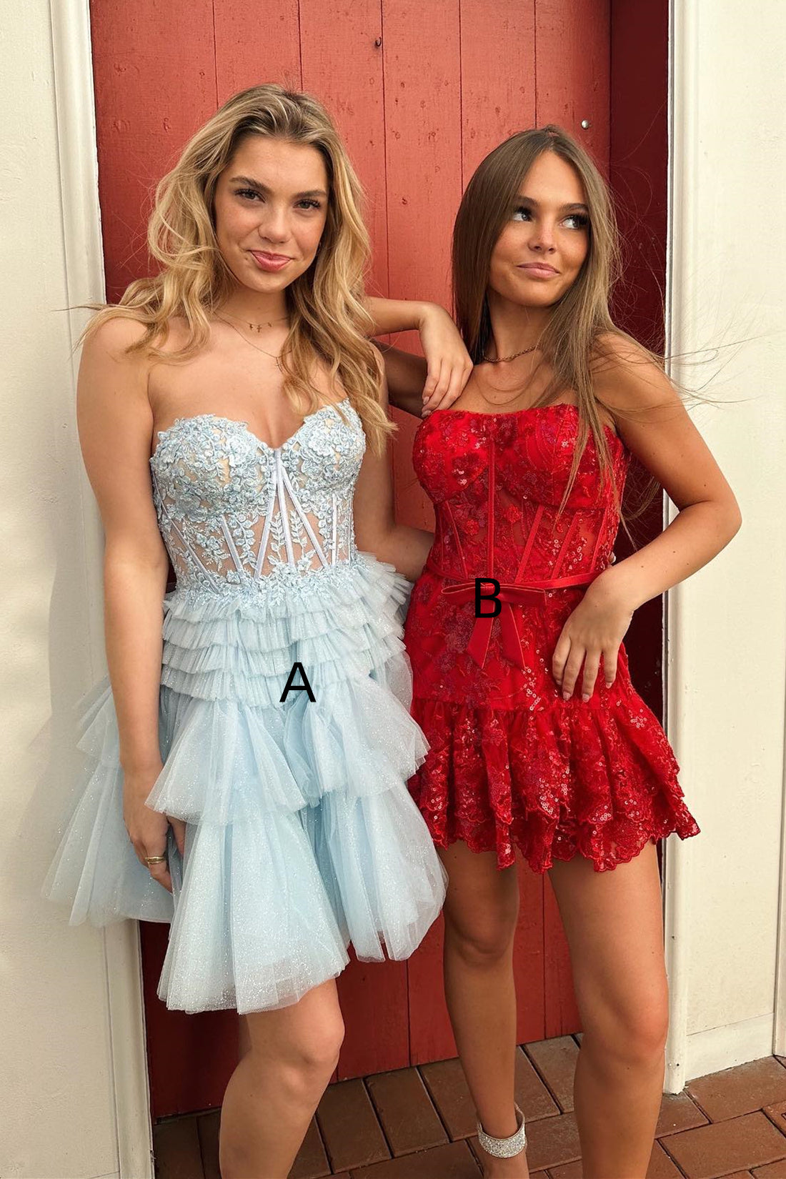Fancyvestido this red homecoming dress features a strapless neckline, sequins embellishment, tiered short skirt, and zipper back.
